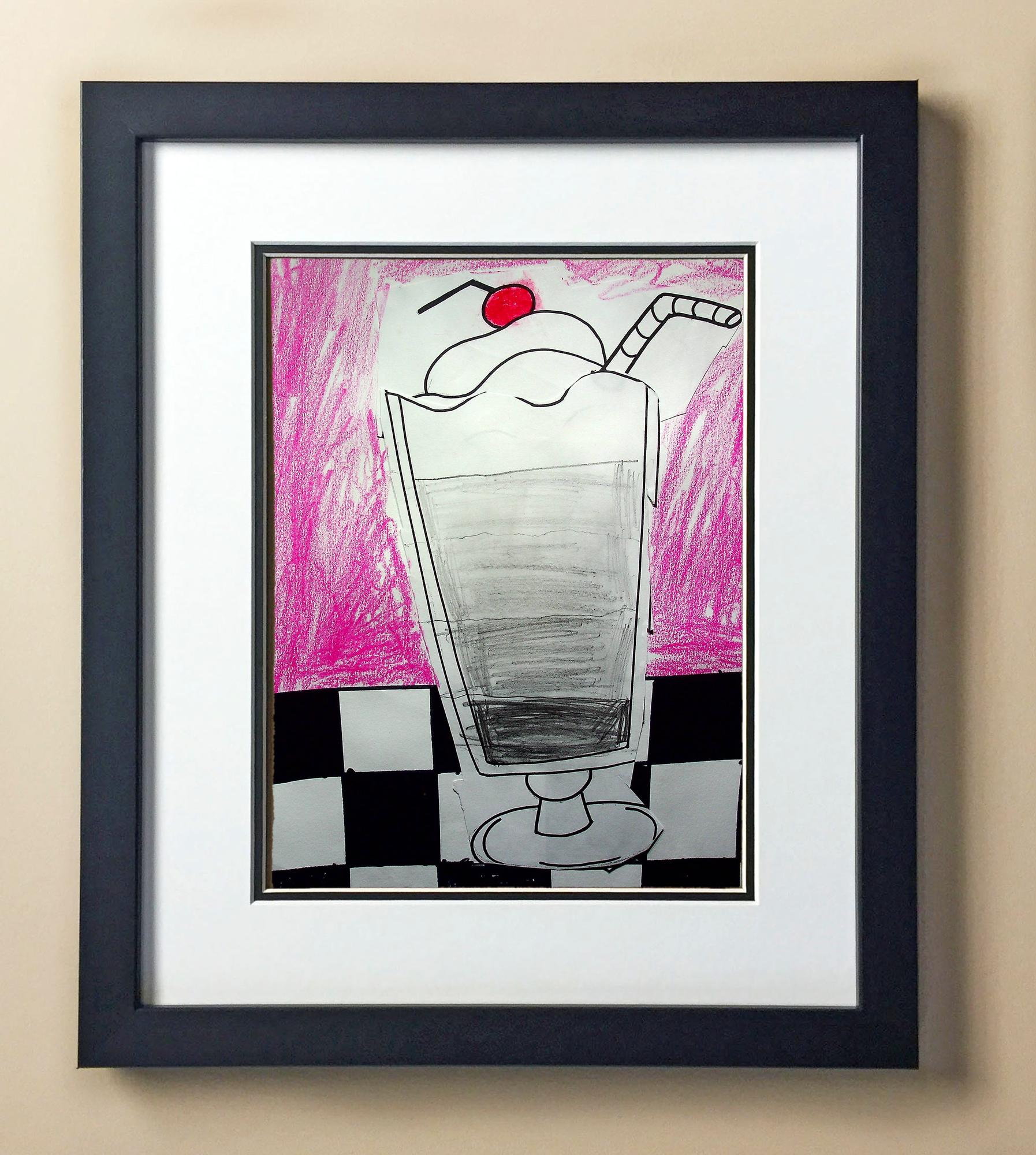 Included with the purchase is the Students Artwork, Frame, double matboard, shatter proof plexiglass, and a ready to hang backerboard with turnbuttons