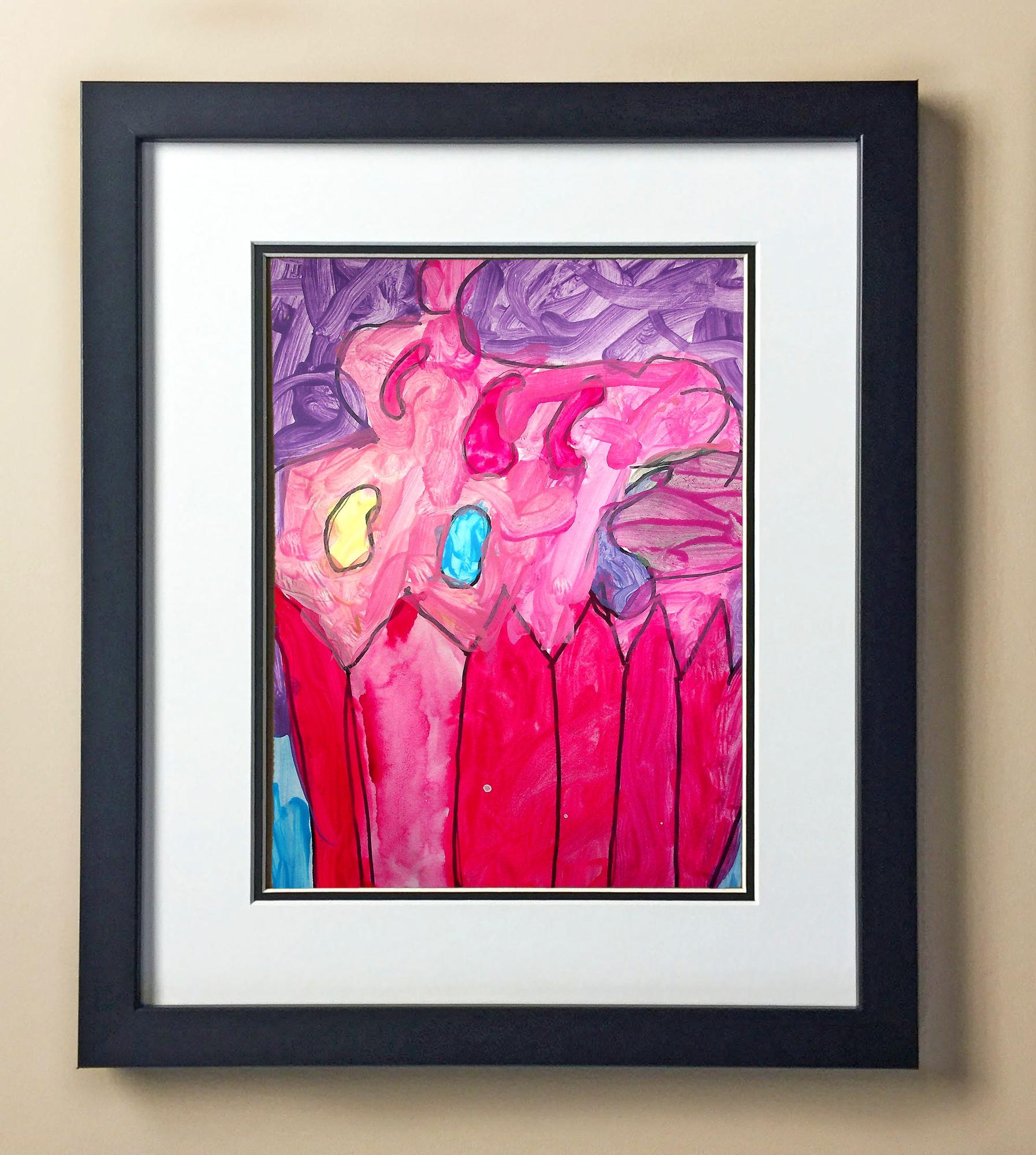 Included with the purchase is the Students Artwork, Frame, double matboard, shatter proof plexiglass, and a ready to hang backerboard with turnbuttons