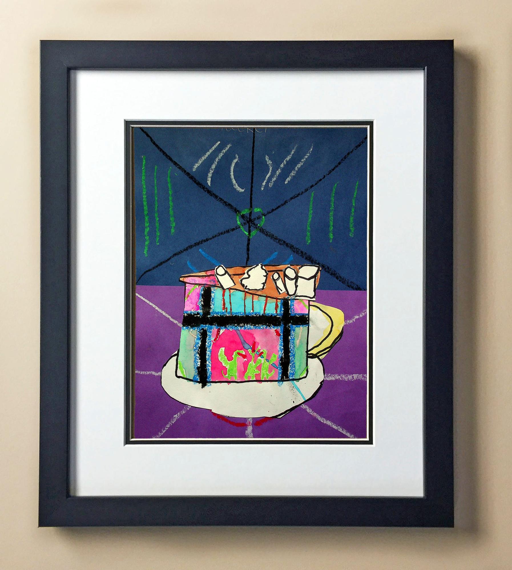 Included with the purchase is the Students Artwork, Frame, double matboard, shatter proof plexiglass, and a ready to hang backerboard with turnbuttons