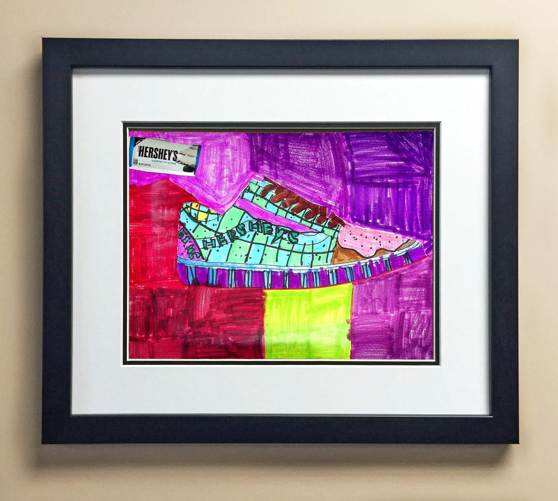 Included with the purchase is the Students Artwork, Frame, double matboard, shatter proof plexiglass, and a ready to hang backerboard with turnbuttons