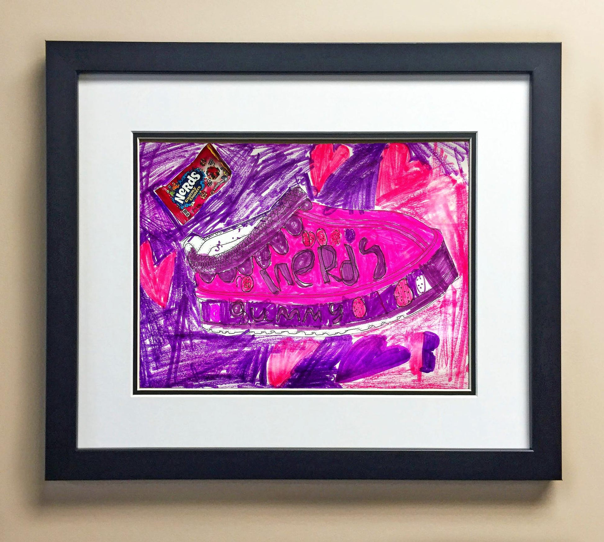 Included with the purchase is the Students Artwork, Frame, double matboard, shatter proof plexiglass, and a ready to hang backerboard with turnbuttons