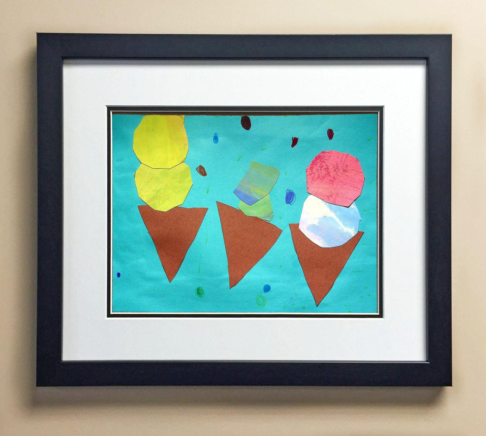 Included with the purchase is the Students Artwork, Frame, double matboard, shatter proof plexiglass, and a ready to hang backerboard with turnbuttons