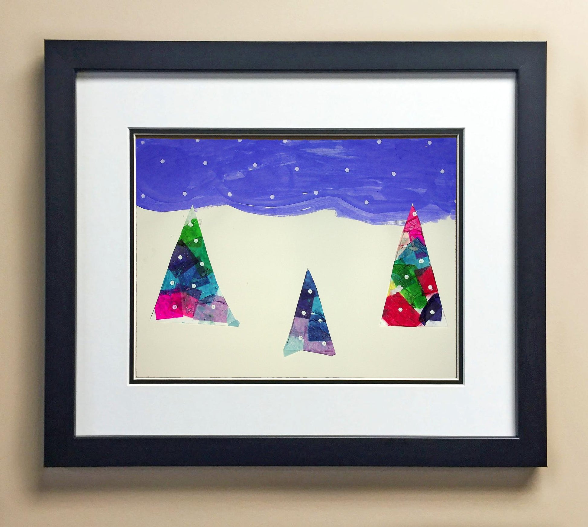 Included with the purchase is the Students Artwork, Frame, double matboard, shatter proof plexiglass, and a ready to hang backerboard with turnbuttons