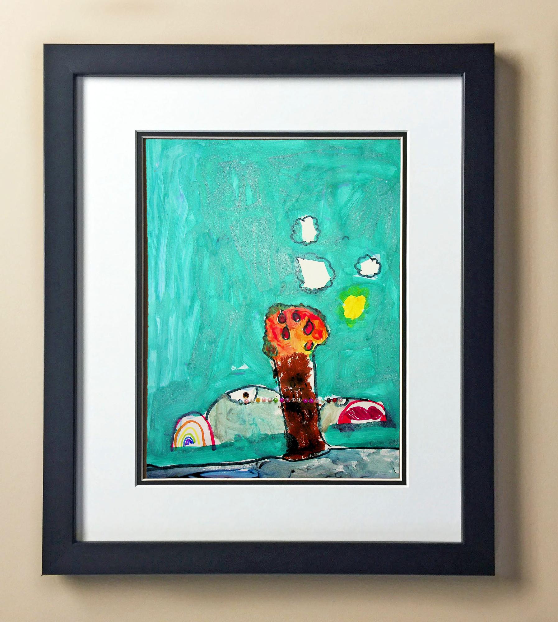 Included with the purchase is the Students Artwork, Frame, double matboard, shatter proof plexiglass, and a ready to hang backerboard with turnbuttons