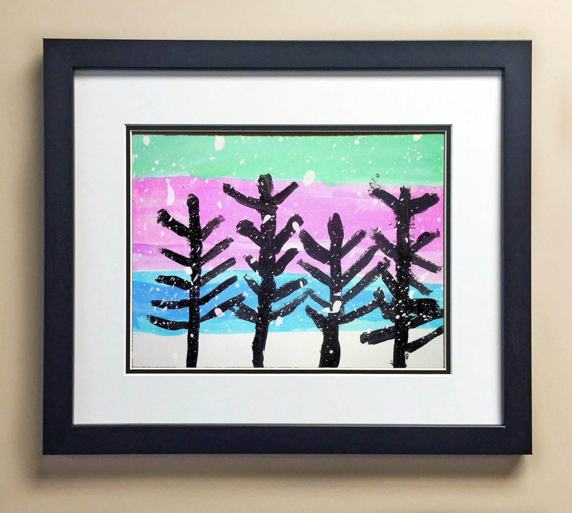 Included with the purchase is the Students Artwork, Frame, double matboard, shatter proof plexiglass, and a ready to hang backerboard with turnbuttons