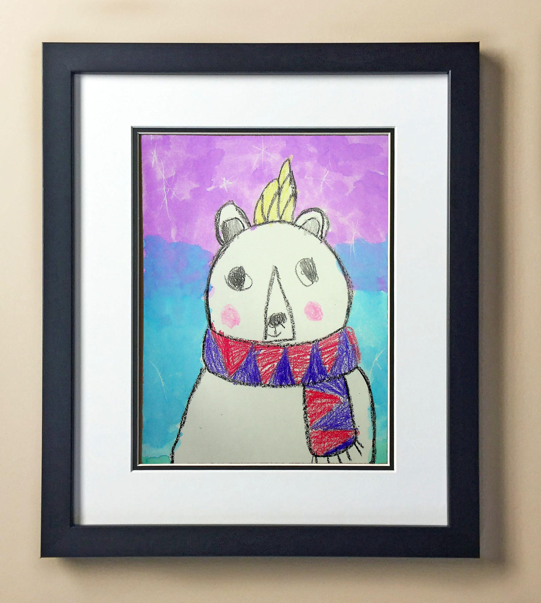 Included with the purchase is the Students Artwork, Frame, double matboard, shatter proof plexiglass, and a ready to hang backerboard with turnbuttons