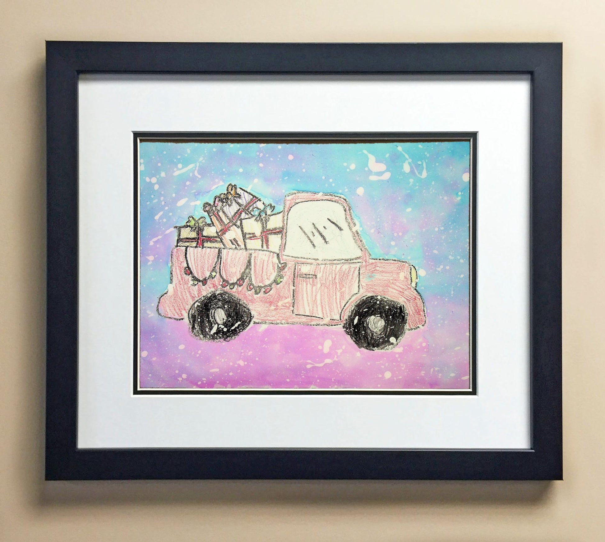 Included with the purchase is the Students Artwork, Frame, double matboard, shatter proof plexiglass, and a ready to hang backerboard with turnbuttons