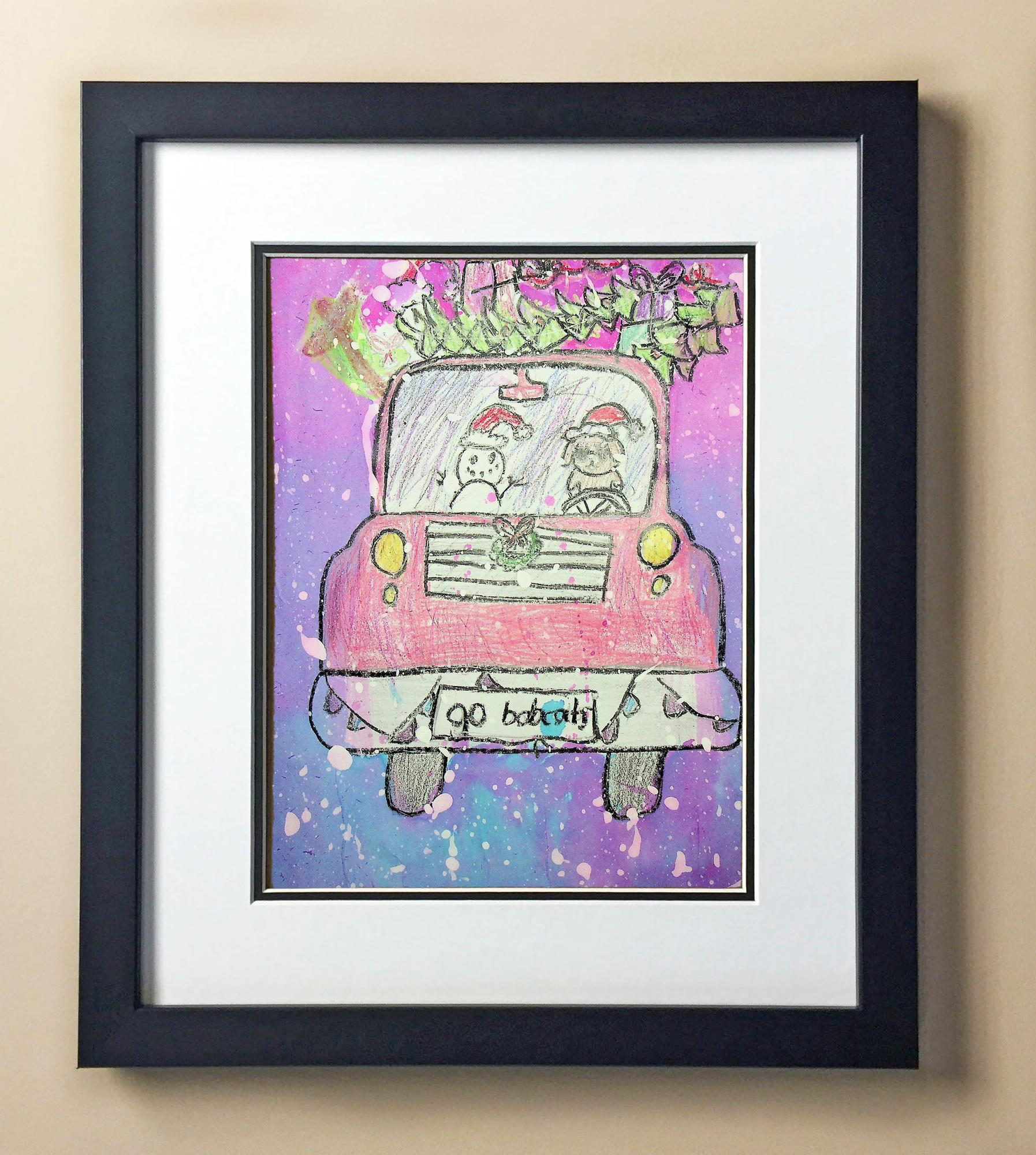 Included with the purchase is the Students Artwork, Frame, double matboard, shatter proof plexiglass, and a ready to hang backerboard with turnbuttons