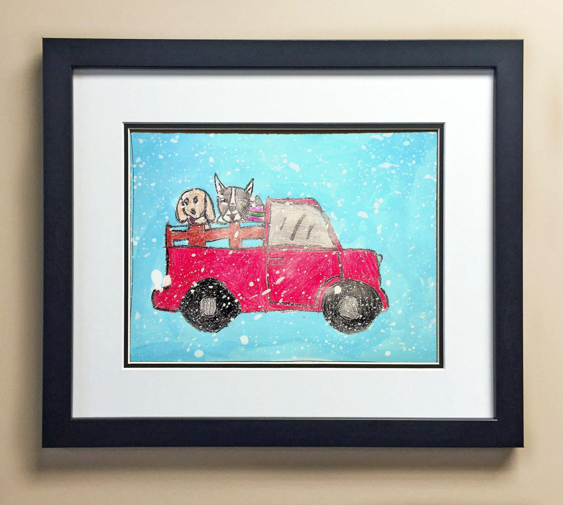 Included with the purchase is the Students Artwork, Frame, double matboard, shatter proof plexiglass, and a ready to hang backerboard with turnbuttons