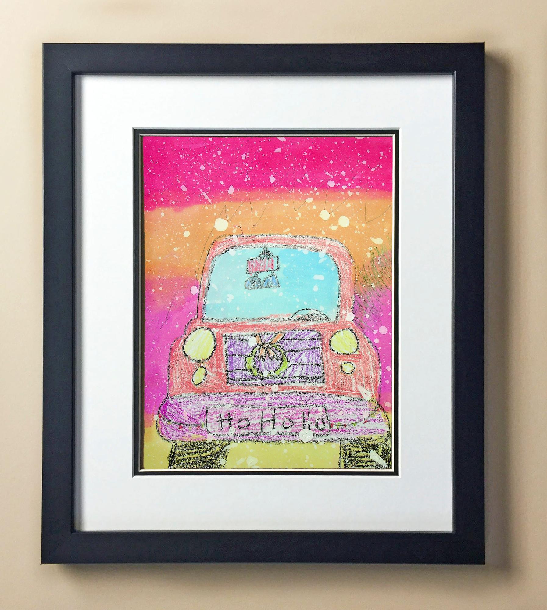 Included with the purchase is the Students Artwork, Frame, double matboard, shatter proof plexiglass, and a ready to hang backerboard with turnbuttons