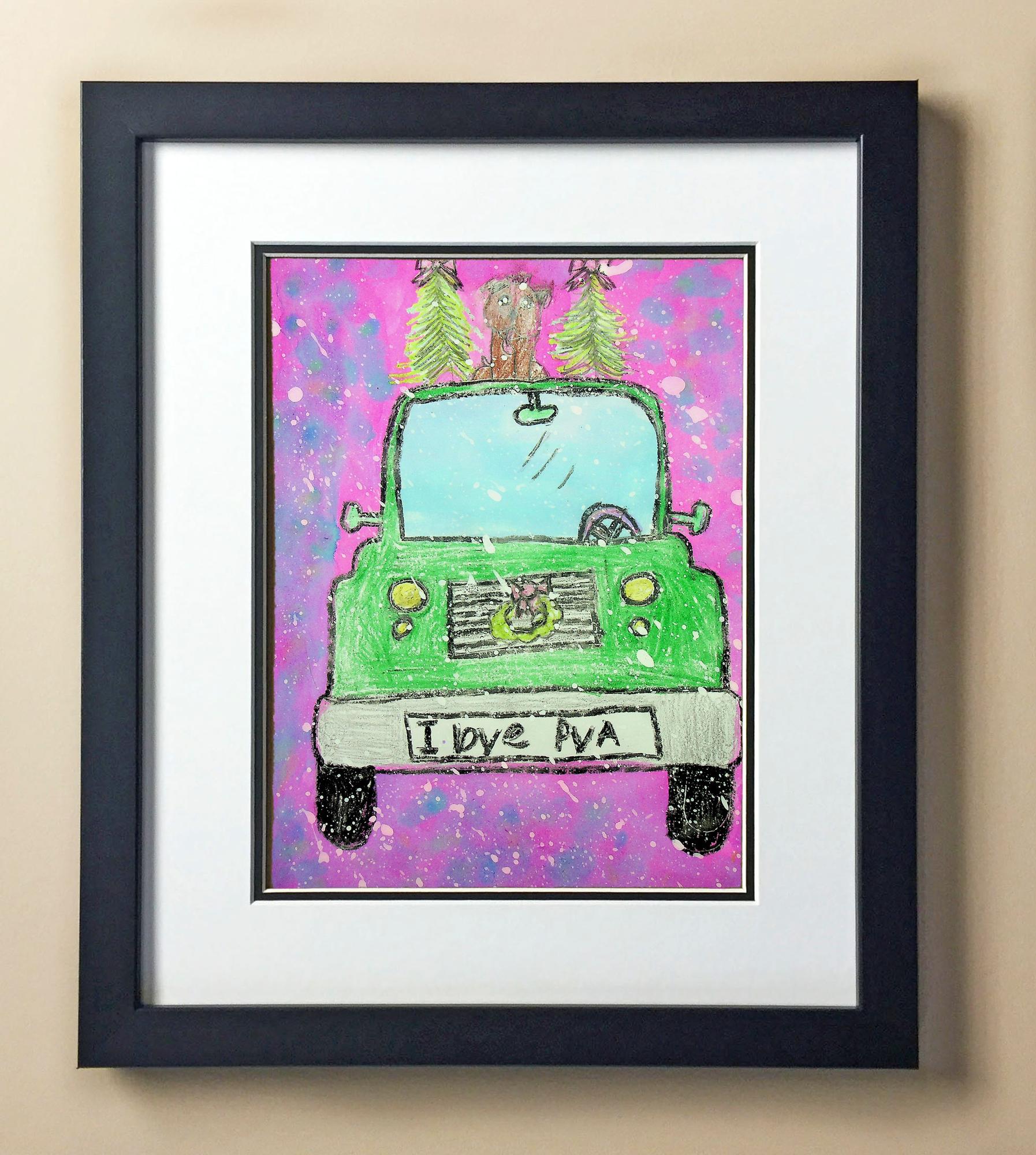 Included with the purchase is the Students Artwork, Frame, double matboard, shatter proof plexiglass, and a ready to hang backerboard with turnbuttons
