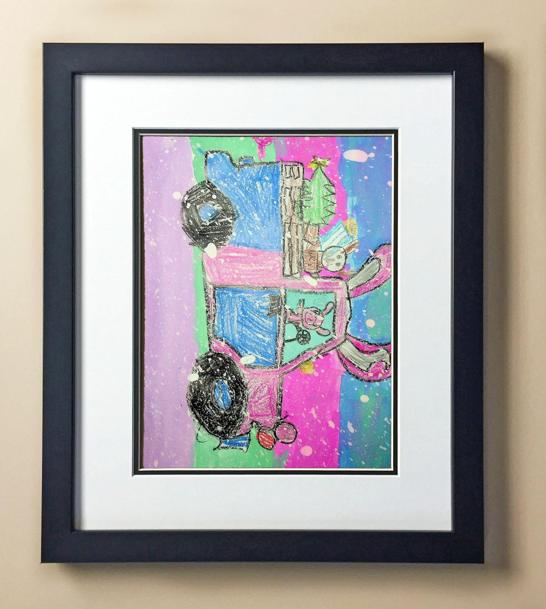 Included with the purchase is the Students Artwork, Frame, double matboard, shatter proof plexiglass, and a ready to hang backerboard with turnbuttons