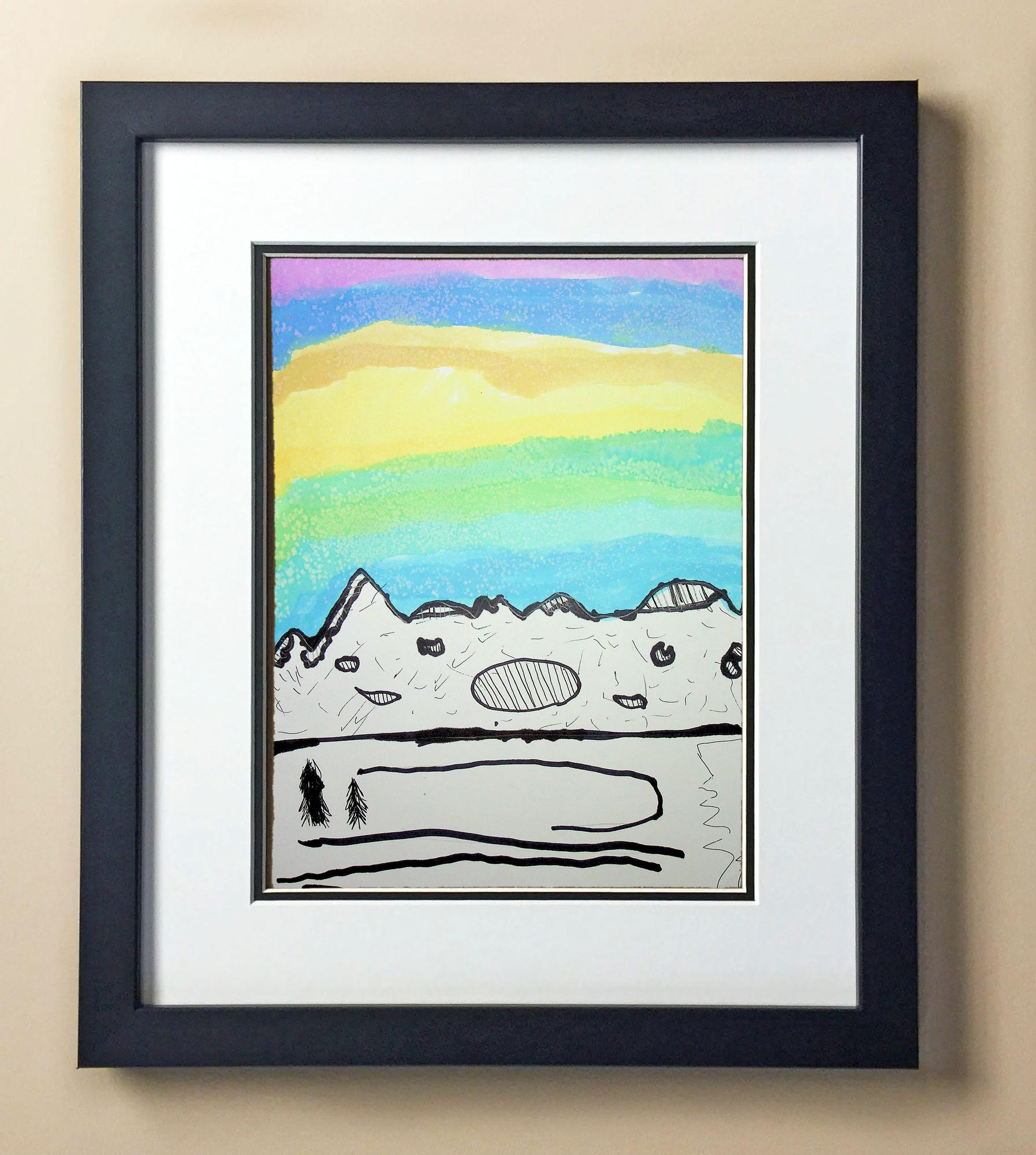 Included with the purchase is the Students Artwork, Frame, double matboard, shatter proof plexiglass, and a ready to hang backerboard with turnbuttons