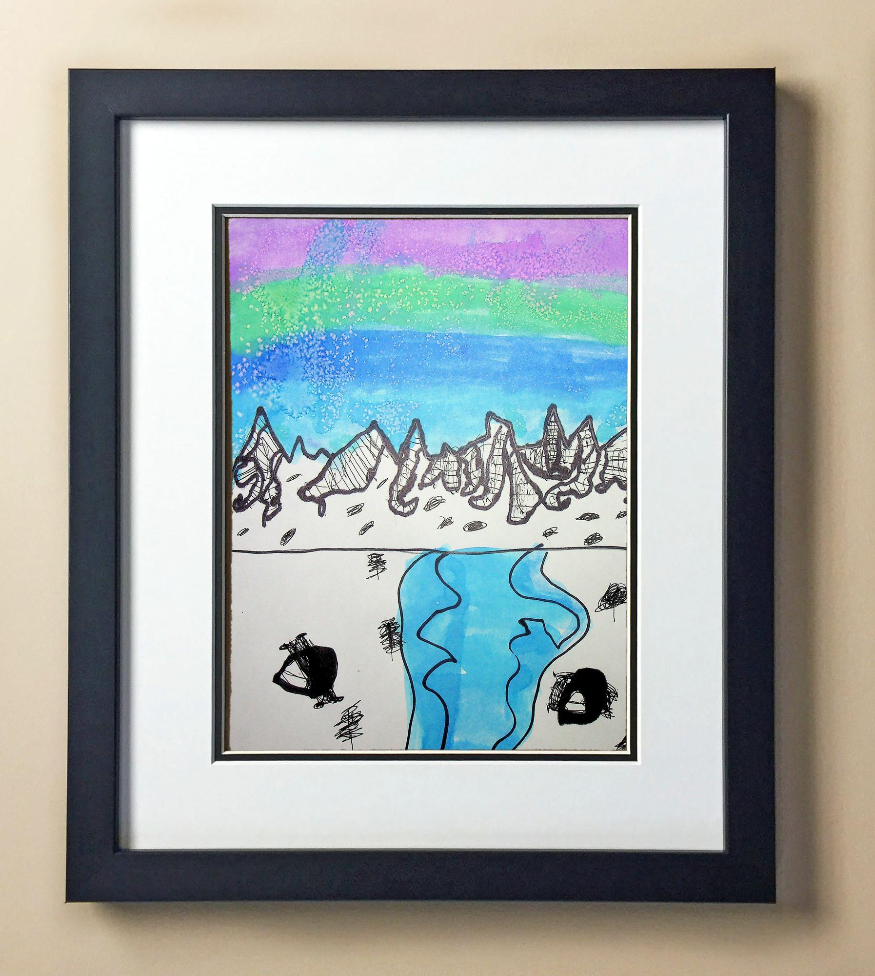 Included with the purchase is the Students Artwork, Frame, double matboard, shatter proof plexiglass, and a ready to hang backerboard with turnbuttons