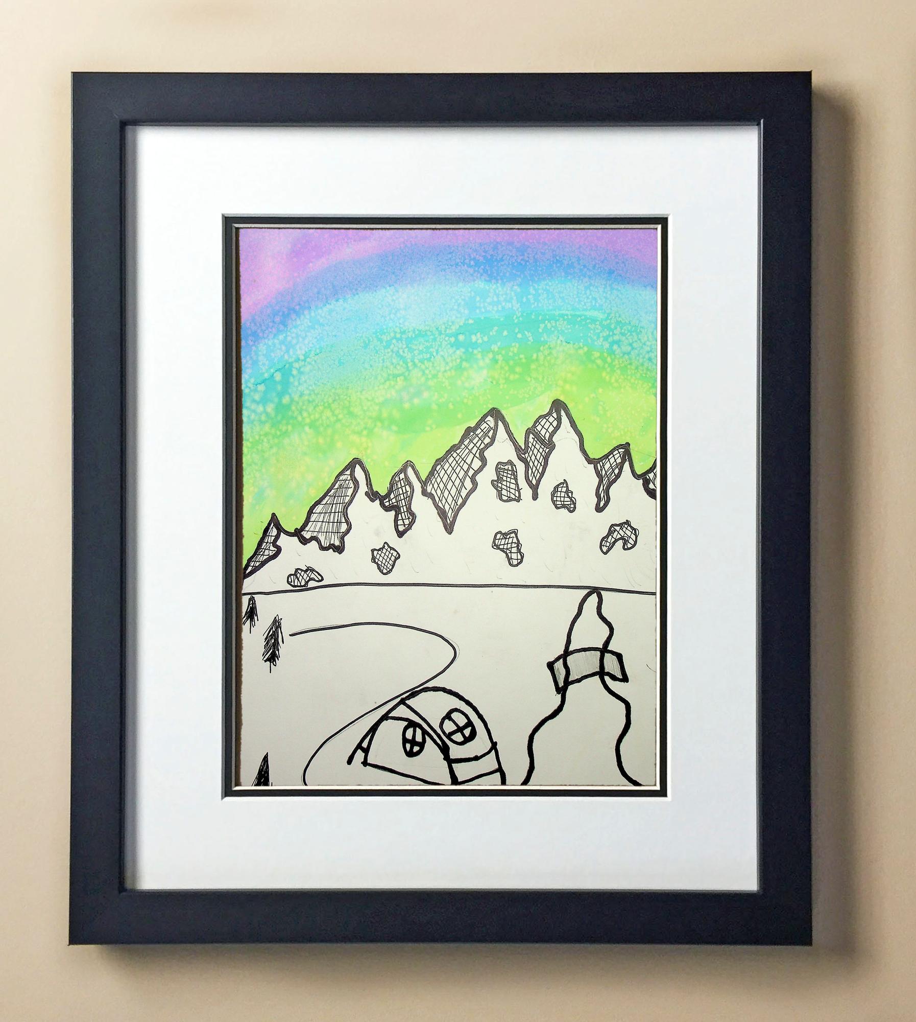Included with the purchase is the Students Artwork, Frame, double matboard, shatter proof plexiglass, and a ready to hang backerboard with turnbuttons