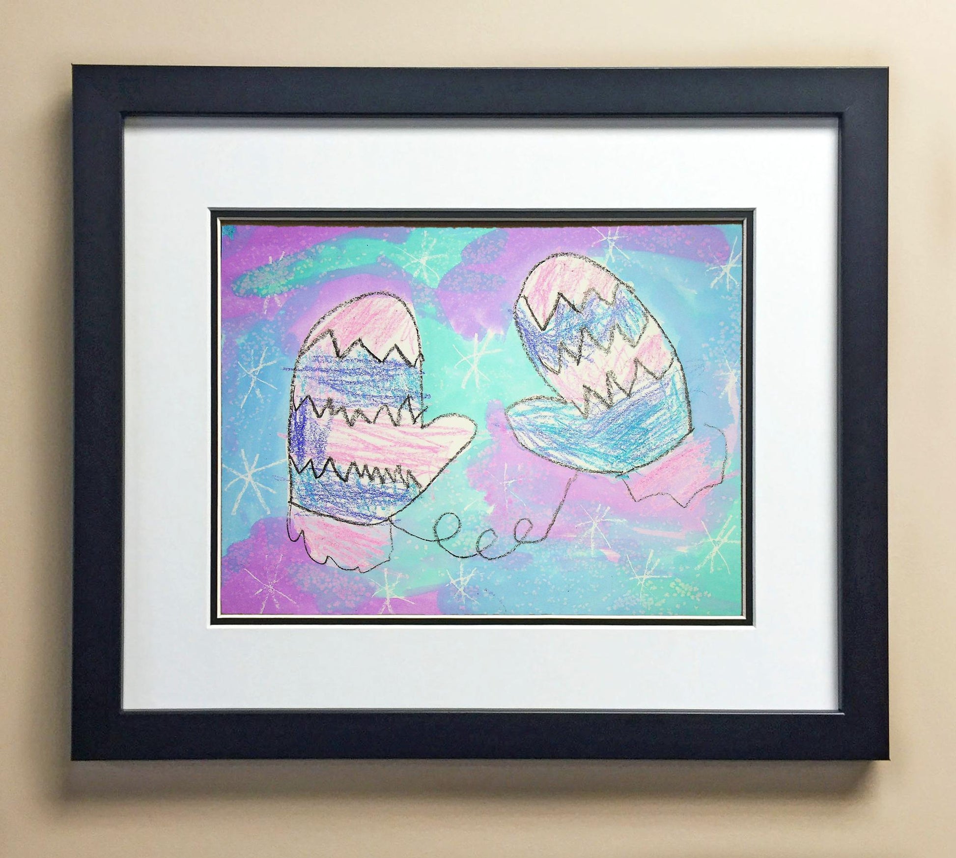 Included with the purchase is the Students Artwork, Frame, double matboard, shatter proof plexiglass, and a ready to hang backerboard with turnbuttons