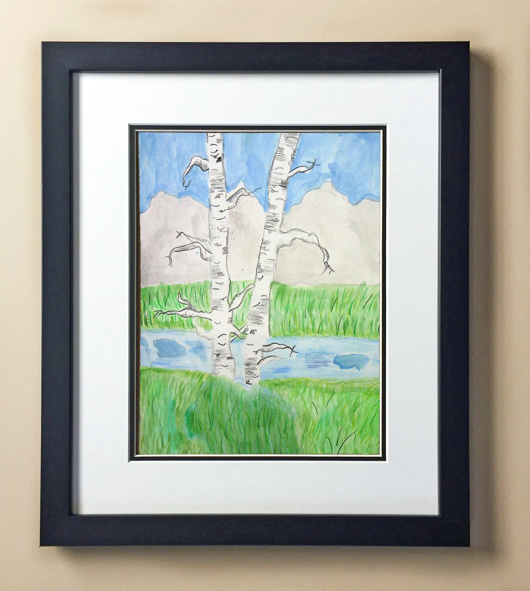 Included with the purchase is the Students Artwork, Frame, double matboard, shatter proof plexiglass, and a ready to hang backerboard with turnbuttons
