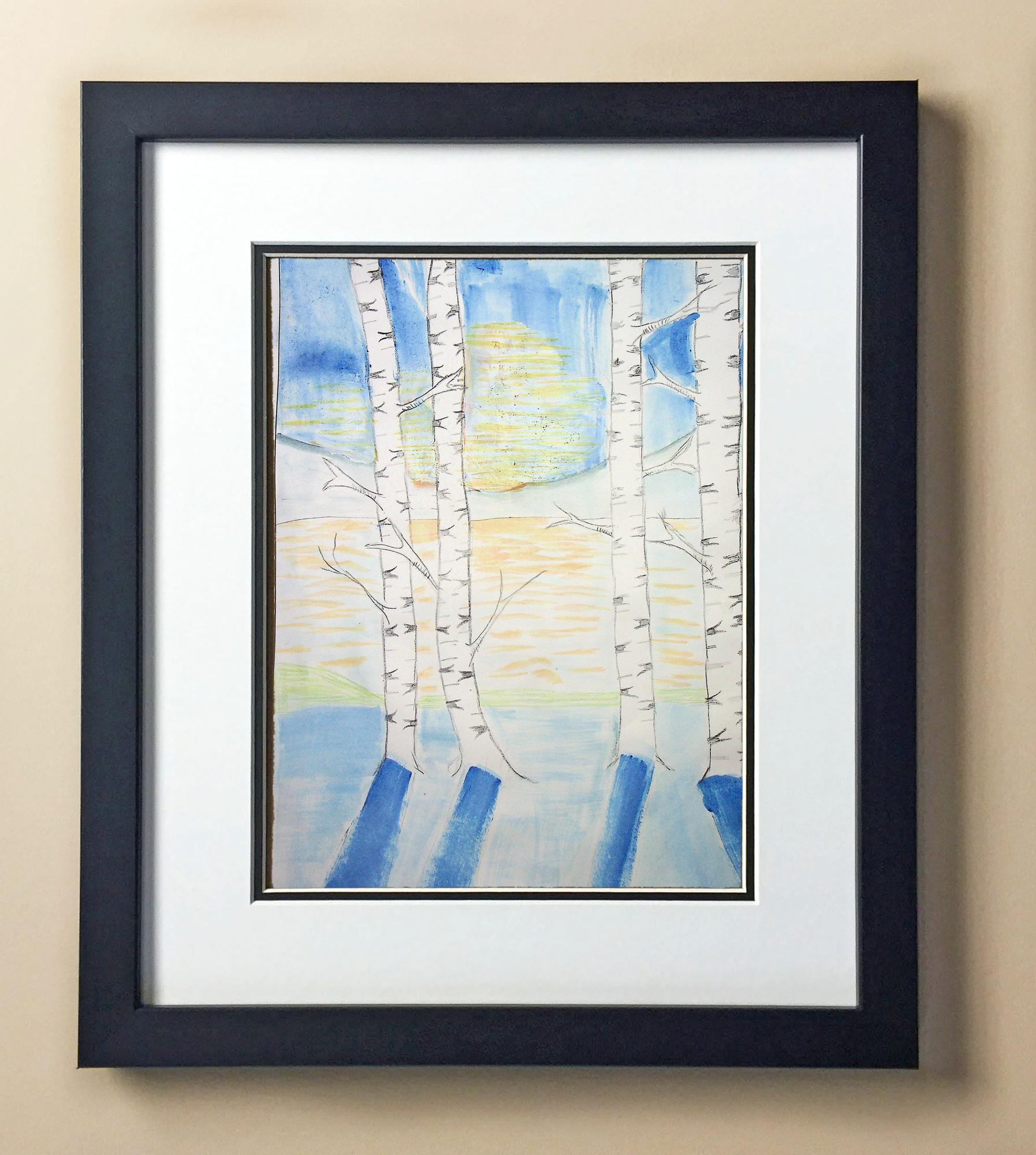 Included with the purchase is the Students Artwork, Frame, double matboard, shatter proof plexiglass, and a ready to hang backerboard with turnbuttons
