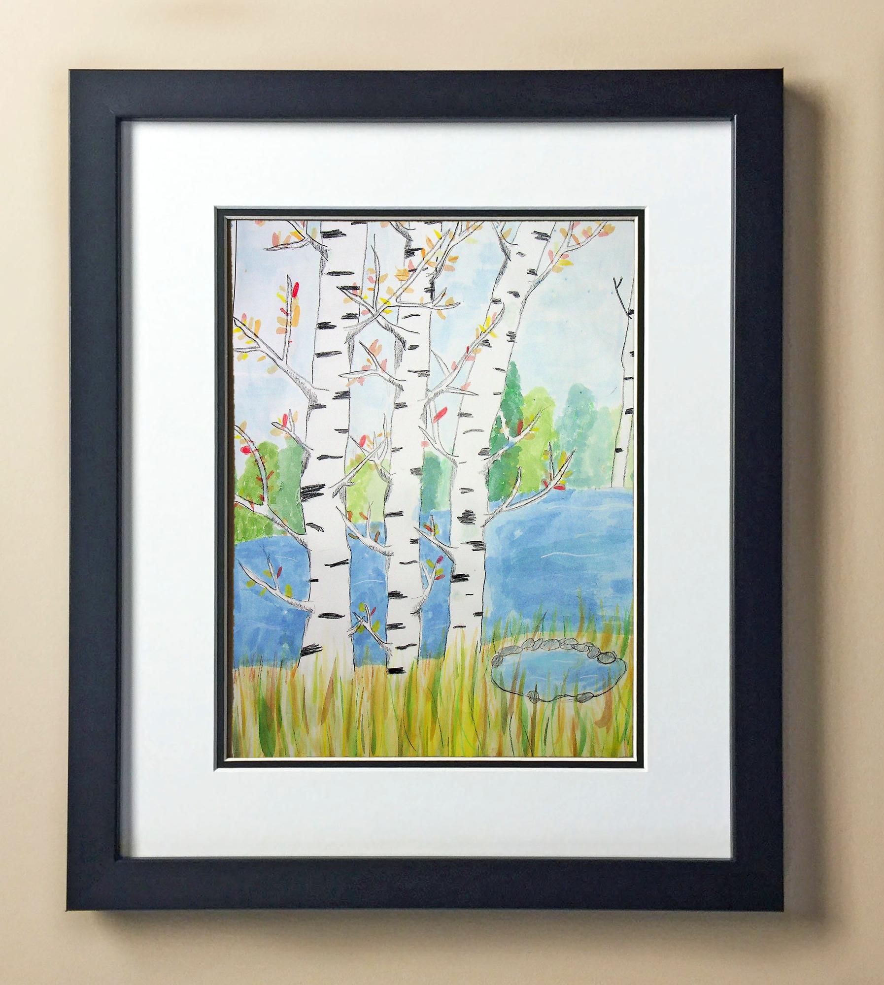 Included with the purchase is the Students Artwork, Frame, double matboard, shatter proof plexiglass, and a ready to hang backerboard with turnbuttons
