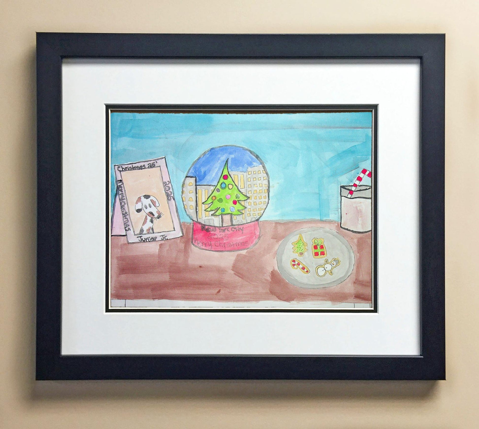 Included with the purchase is the Students Artwork, Frame, double matboard, shatter proof plexiglass, and a ready to hang backerboard with turnbuttons