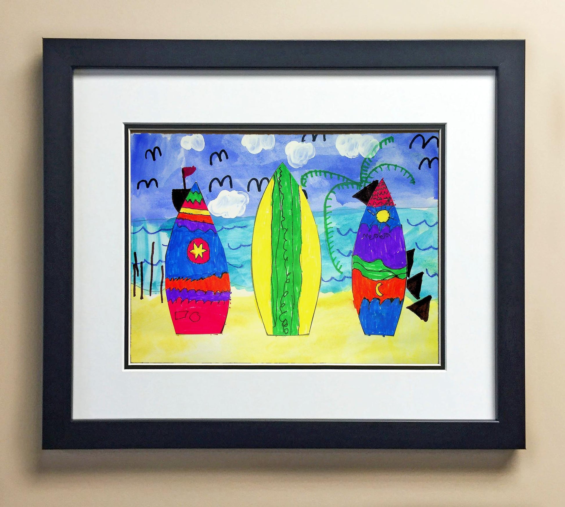 Included with the purchase is the Students Artwork, Frame, double matboard, shatter proof plexiglass, and a ready to hang backerboard with turnbuttons