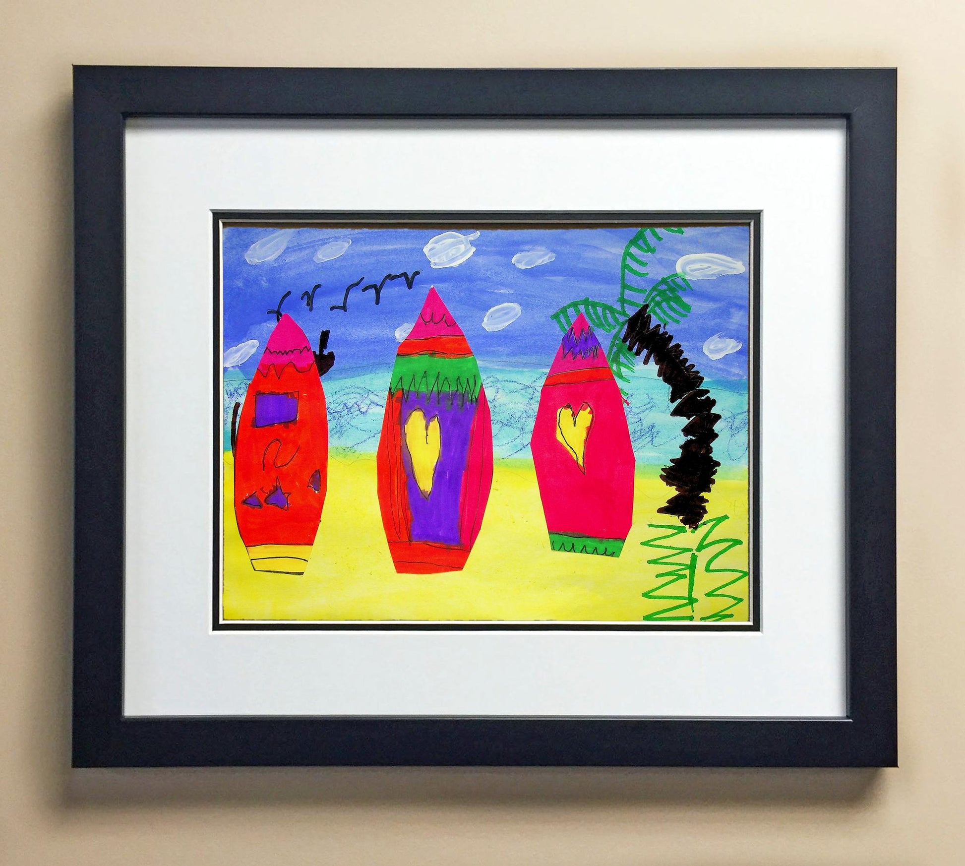 Included with the purchase is the Students Artwork, Frame, double matboard, shatter proof plexiglass, and a ready to hang backerboard with turnbuttons