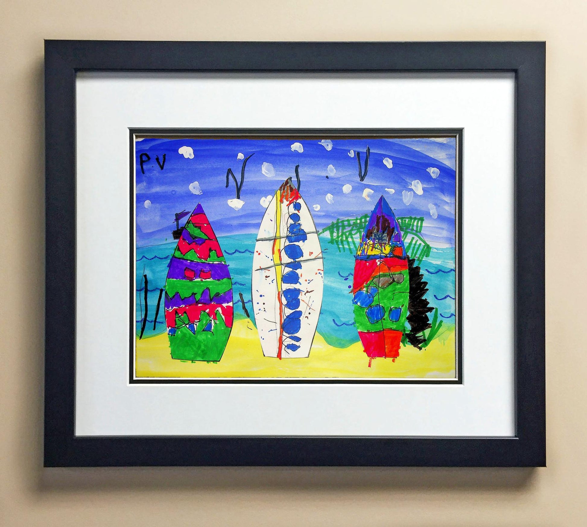 Included with the purchase is the Students Artwork, Frame, double matboard, shatter proof plexiglass, and a ready to hang backerboard with turnbuttons