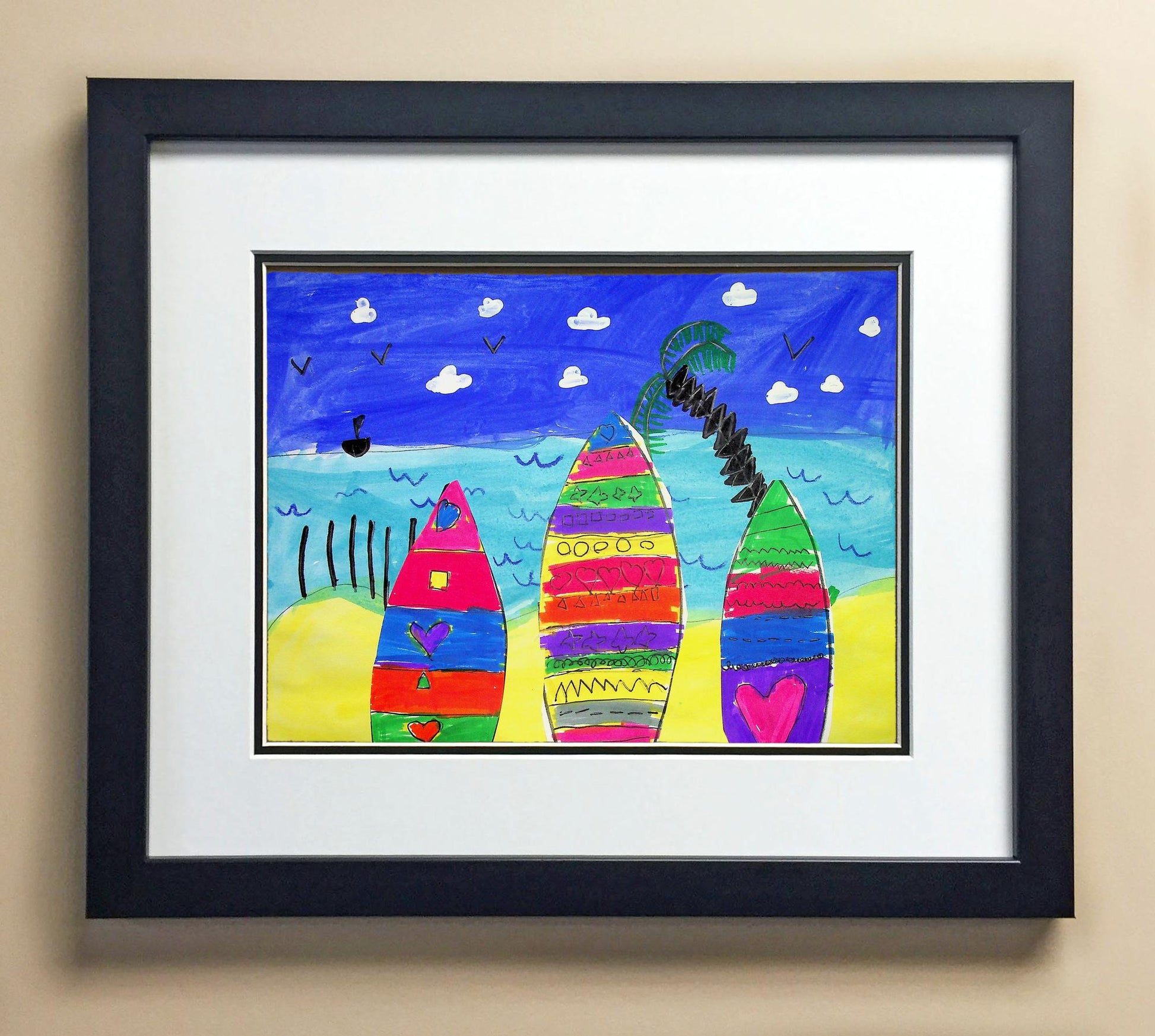 Included with the purchase is the Students Artwork, Frame, double matboard, shatter proof plexiglass, and a ready to hang backerboard with turnbuttons