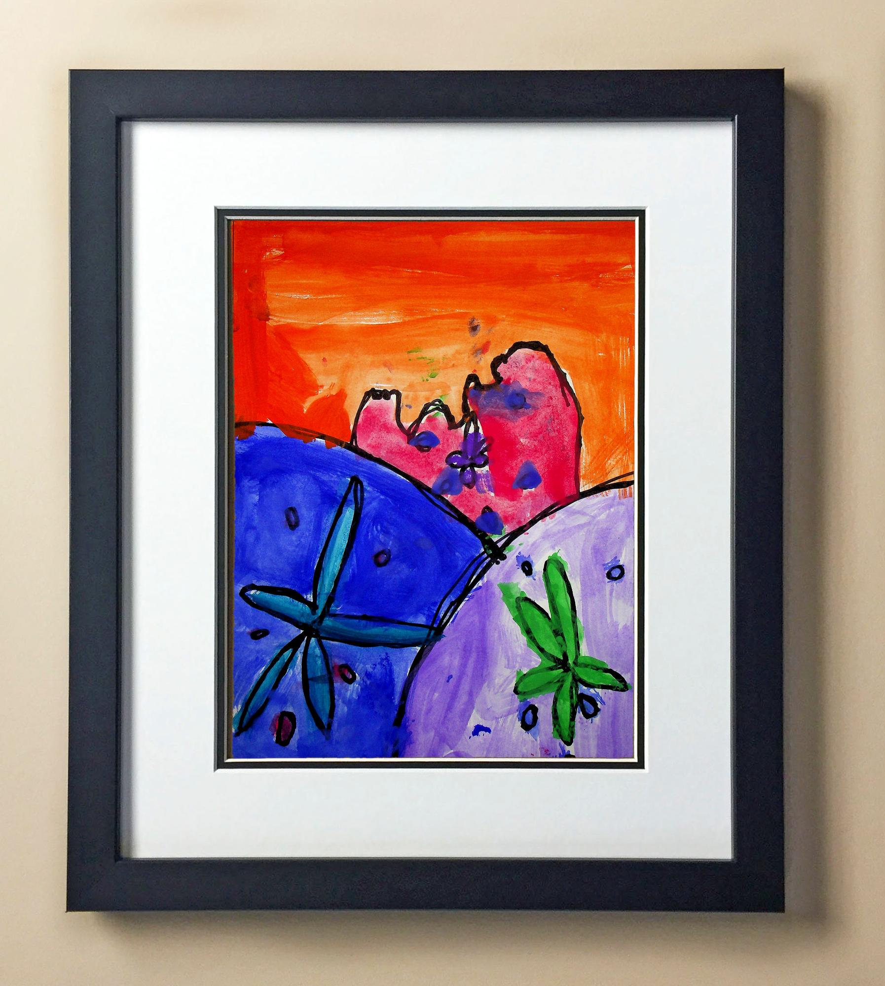 Included with the purchase is the Students Artwork, Frame, double matboard, shatter proof plexiglass, and a ready to hang backerboard with turnbuttons