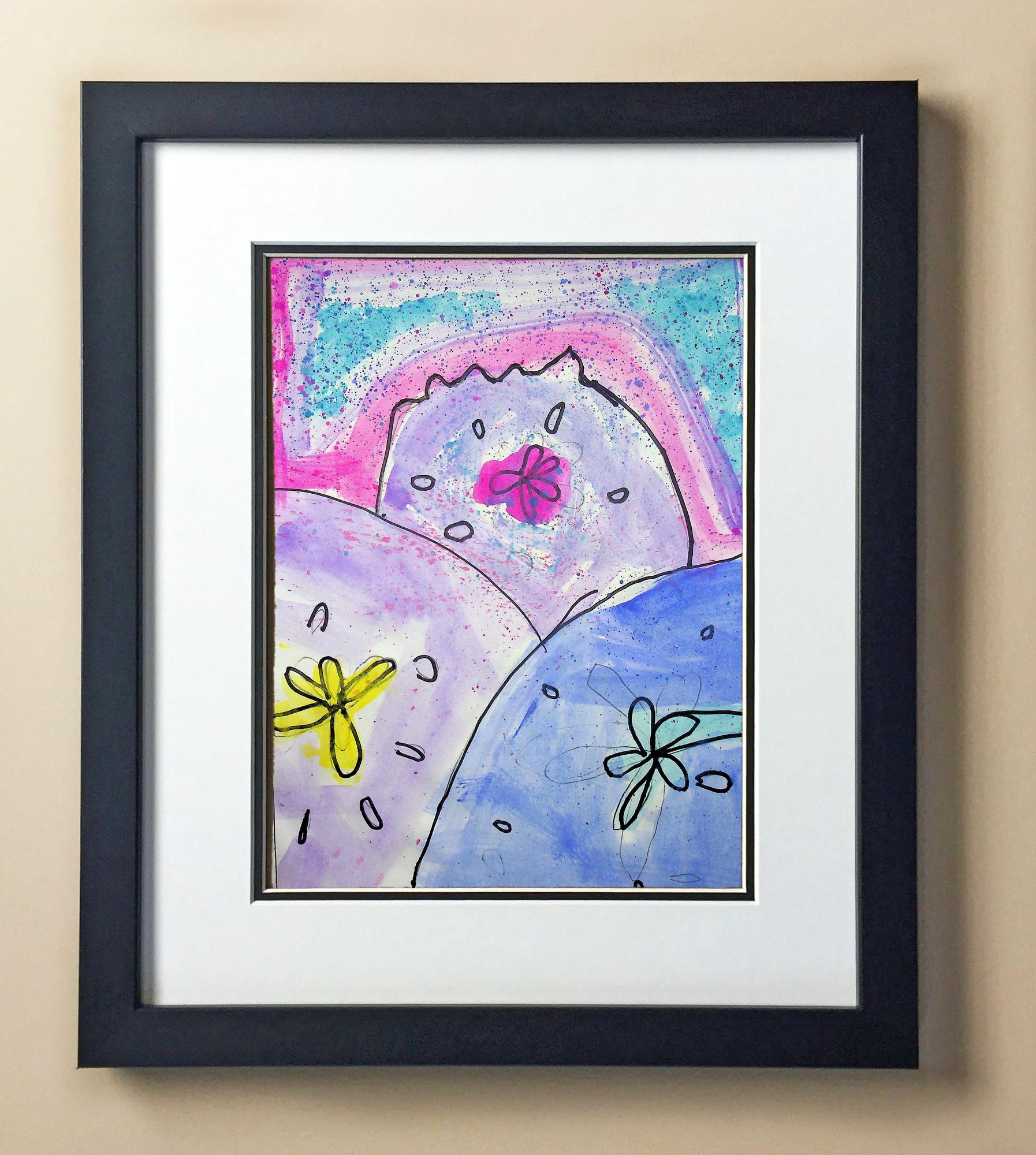 Included with the purchase is the Students Artwork, Frame, double matboard, shatter proof plexiglass, and a ready to hang backerboard with turnbuttons