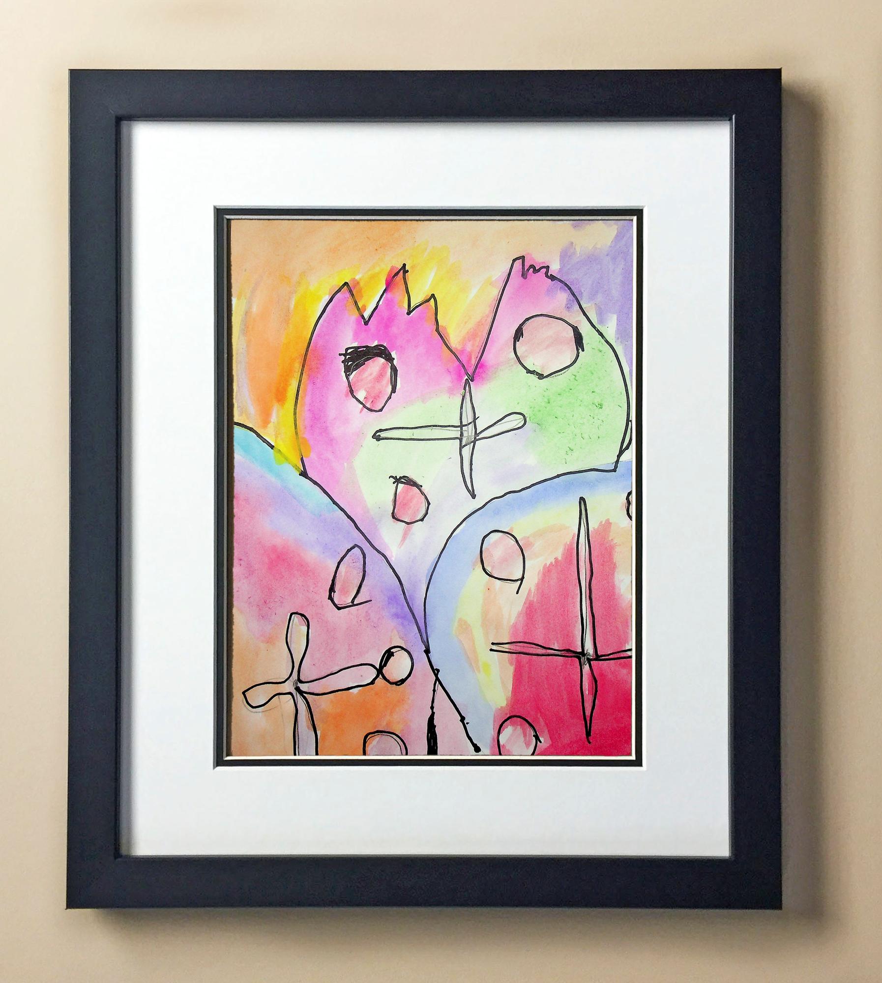 Included with the purchase is the Students Artwork, Frame, double matboard, shatter proof plexiglass, and a ready to hang backerboard with turnbuttons