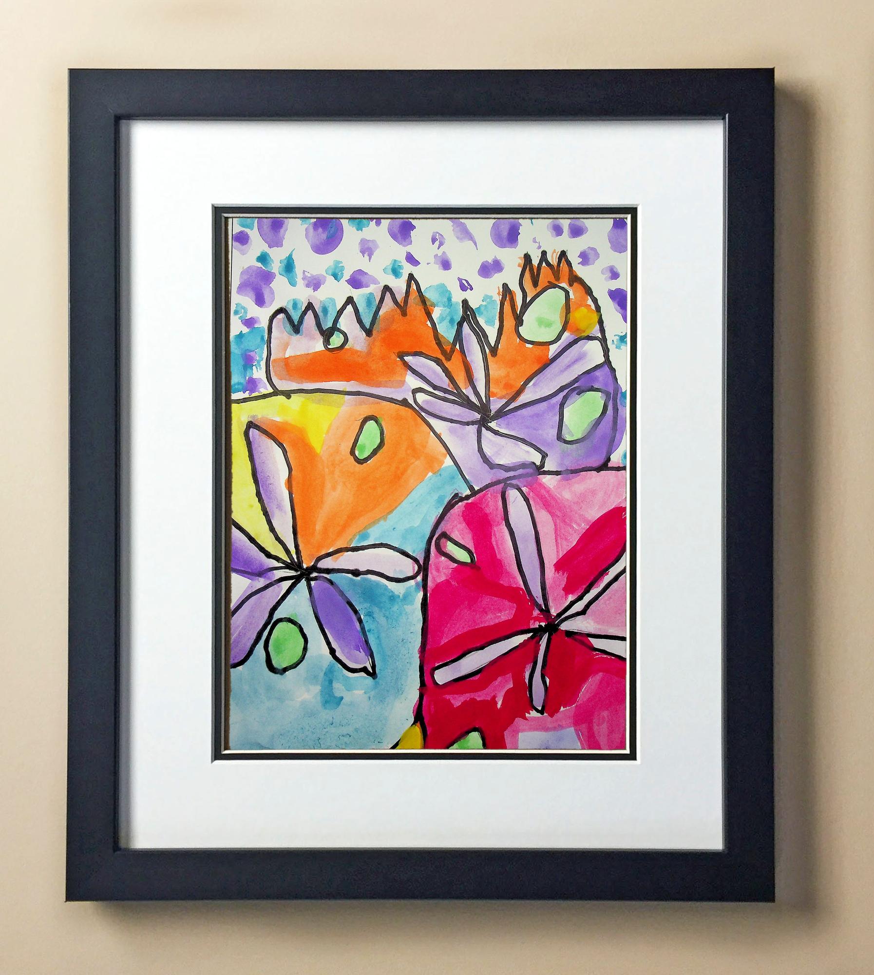 Included with the purchase is the Students Artwork, Frame, double matboard, shatter proof plexiglass, and a ready to hang backerboard with turnbuttons