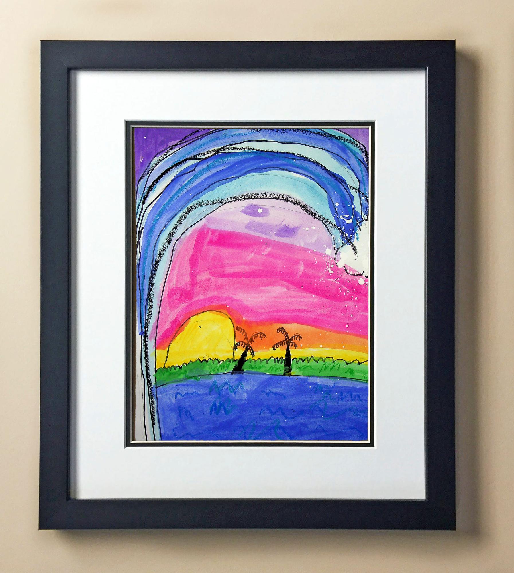 Included with the purchase is the Students Artwork, Frame, double matboard, shatter proof plexiglass, and a ready to hang backerboard with turnbuttons