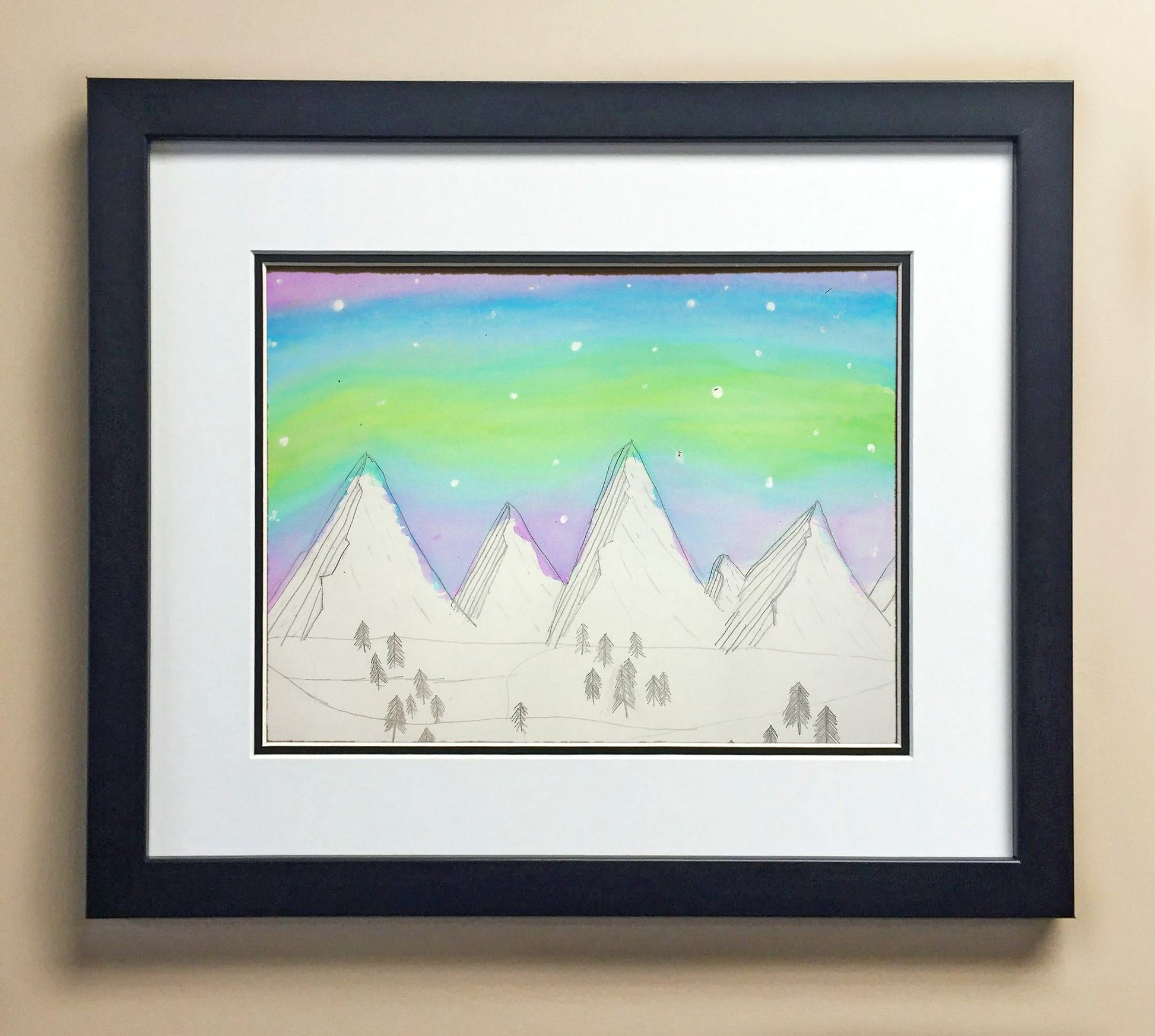 Included with the purchase is the Students Artwork, Frame, double matboard, shatter proof plexiglass, and a ready to hang backerboard with turnbuttons