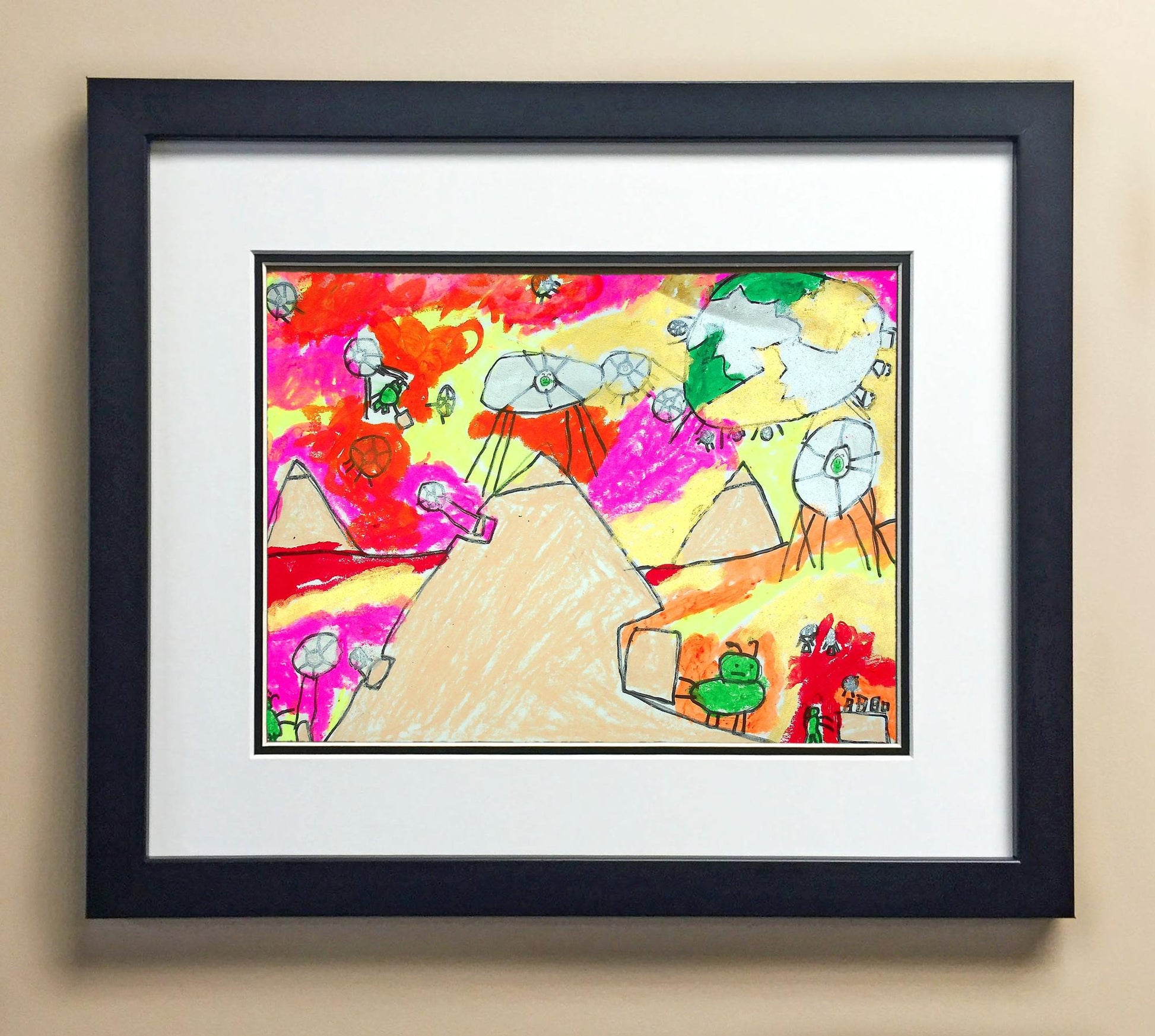 Included with the purchase is the Students Artwork, Frame, double matboard, shatter proof plexiglass, and a ready to hang backerboard with turnbuttons