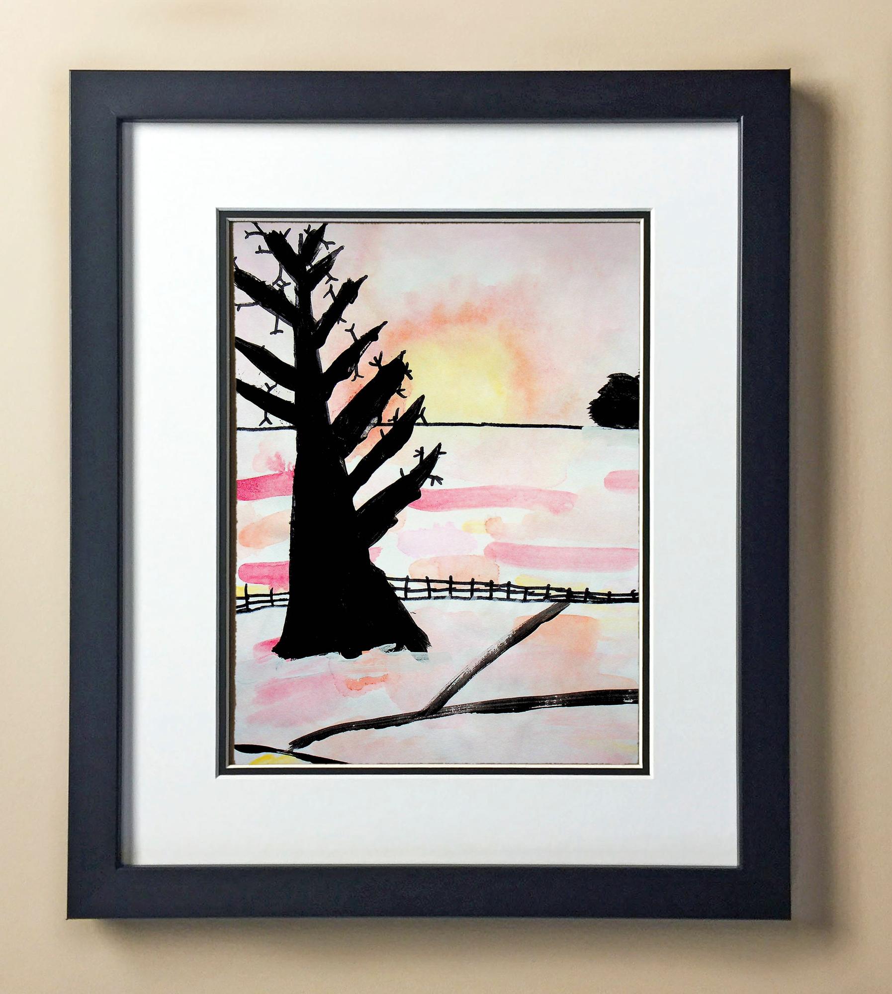 Included with the purchase is the Students Artwork, Frame, double matboard, shatter proof plexiglass, and a ready to hang backerboard with turnbuttons