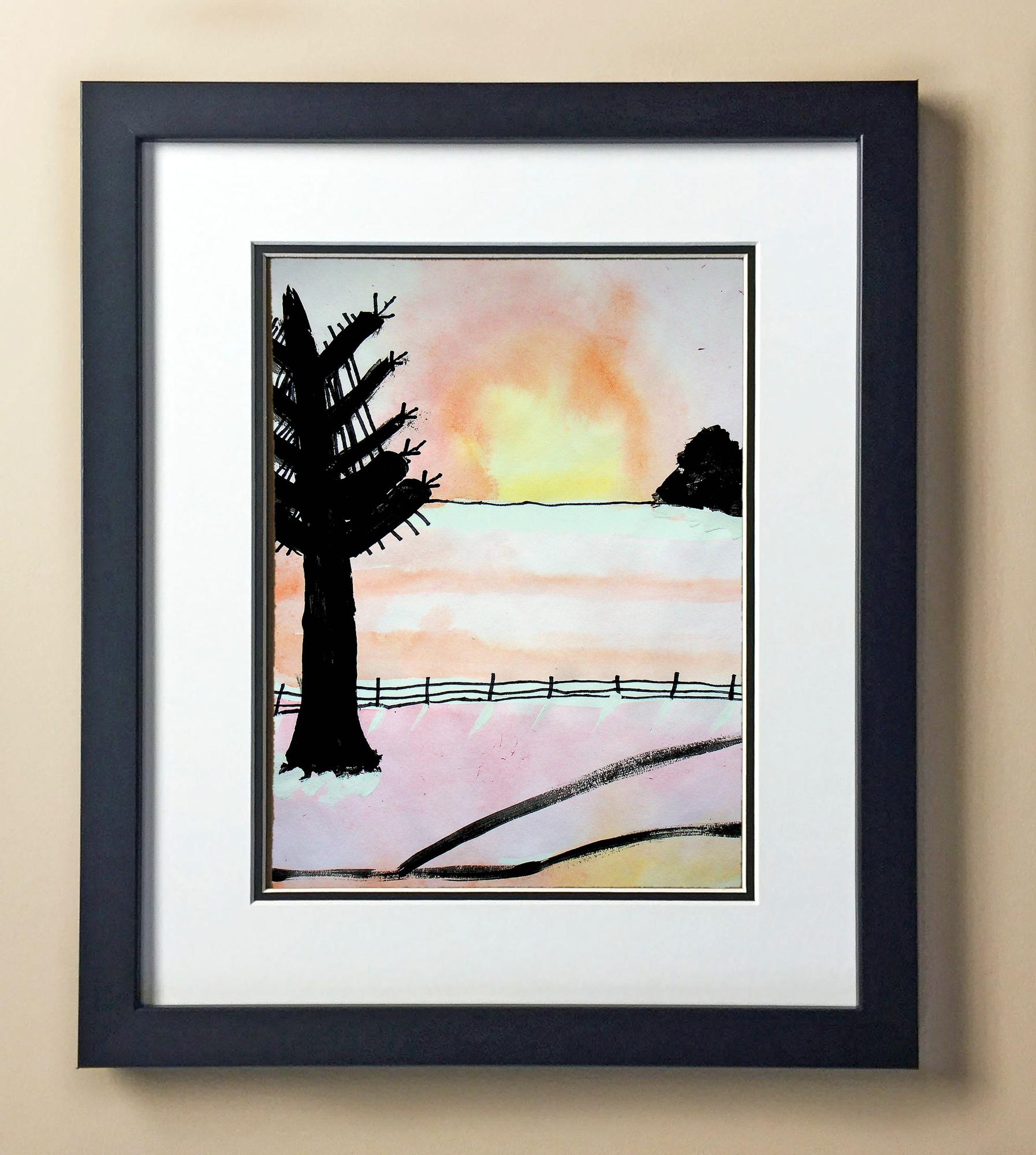 Included with the purchase is the Students Artwork, Frame, double matboard, shatter proof plexiglass, and a ready to hang backerboard with turnbuttons