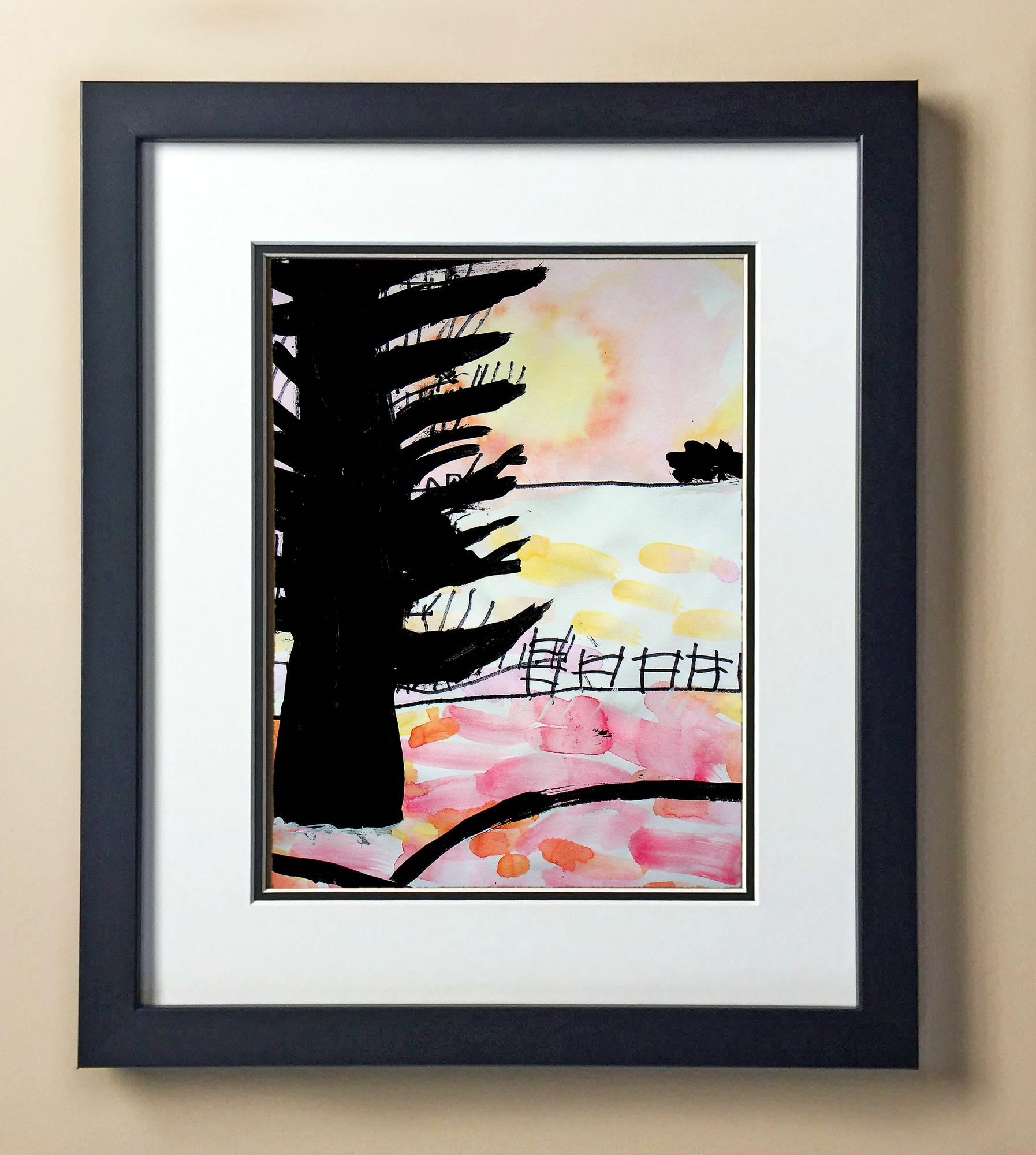 Included with the purchase is the Students Artwork, Frame, double matboard, shatter proof plexiglass, and a ready to hang backerboard with turnbuttons