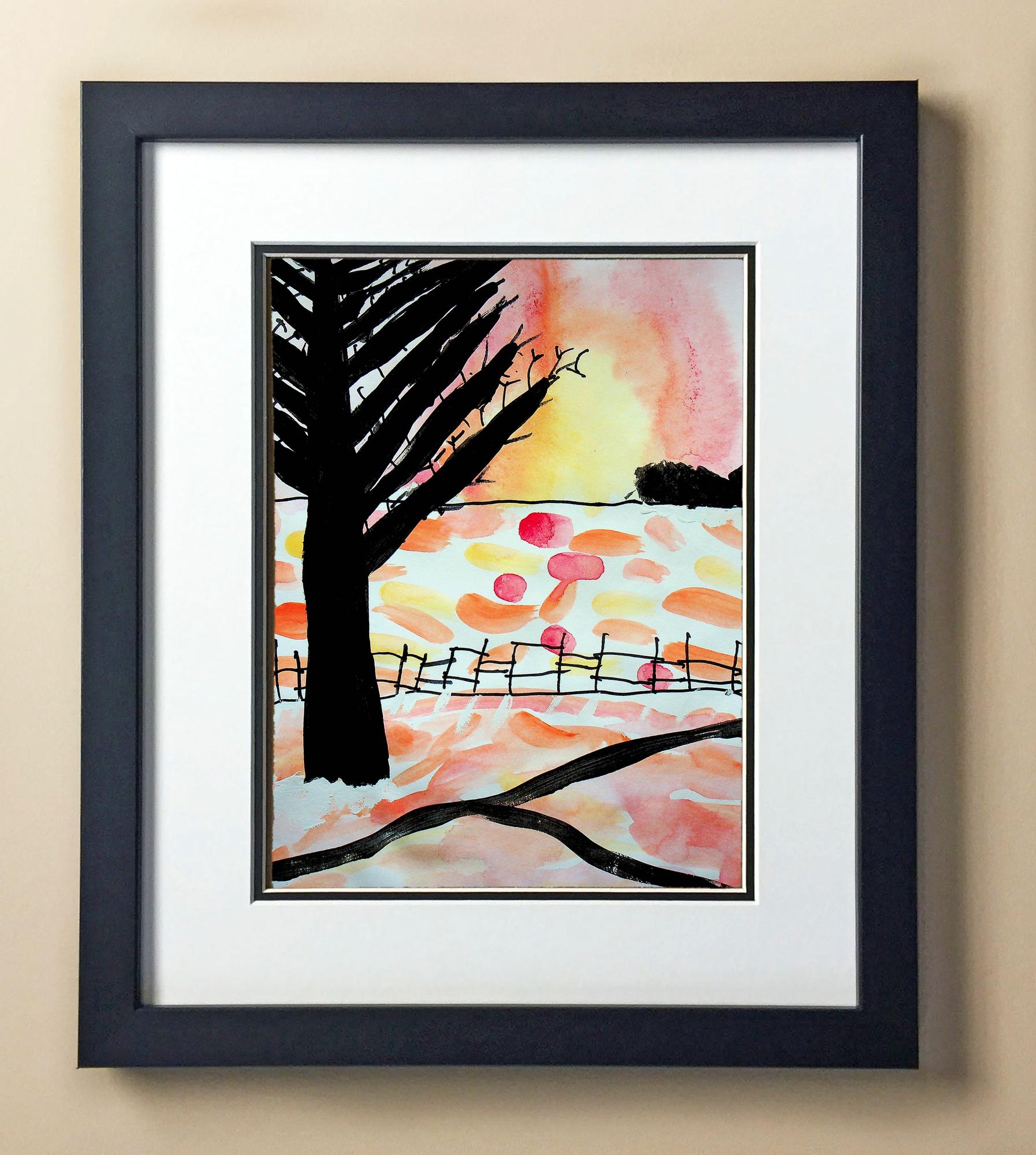 Included with the purchase is the Students Artwork, Frame, double matboard, shatter proof plexiglass, and a ready to hang backerboard with turnbuttons