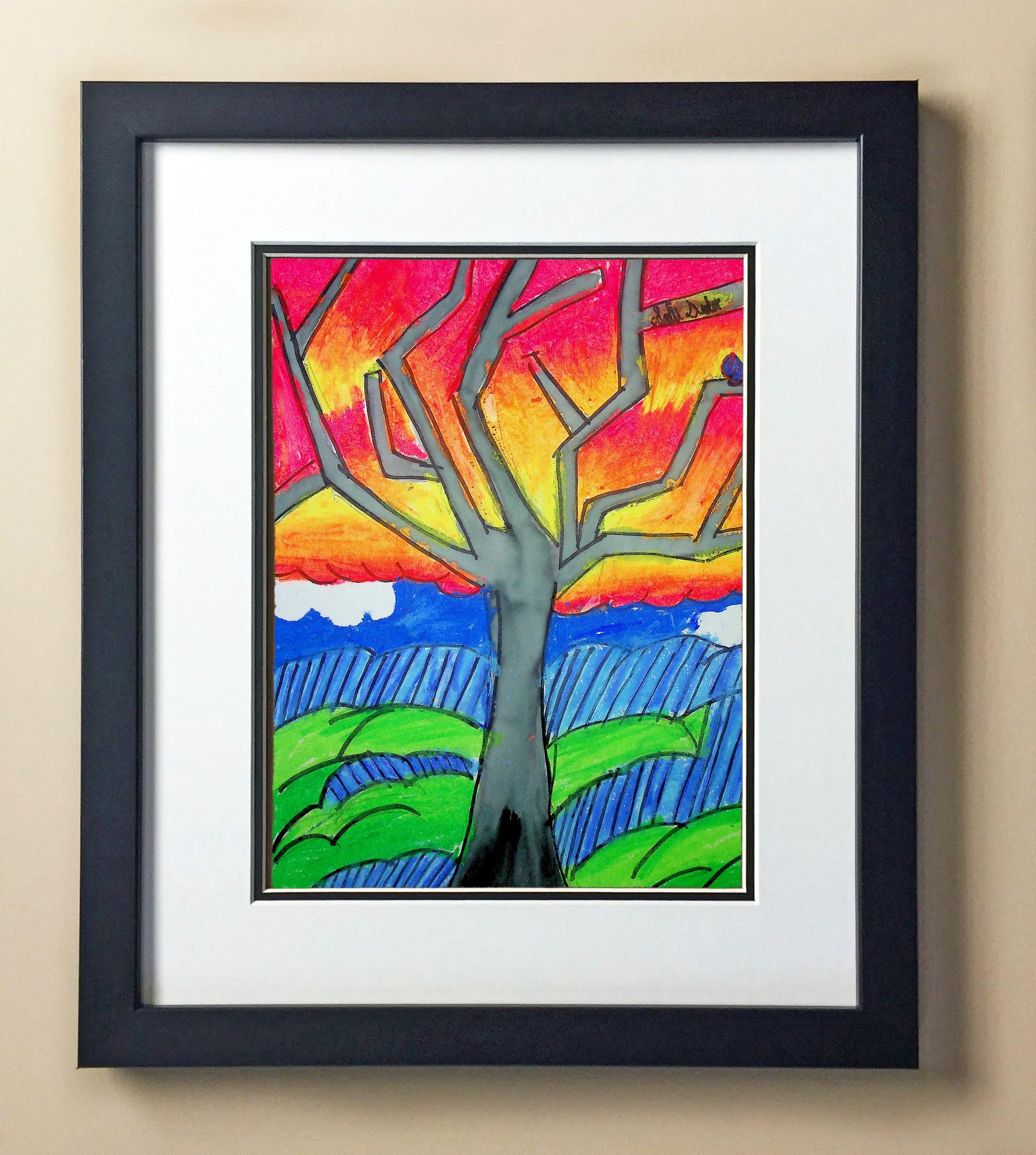 Included with the purchase is the Students Artwork, Frame, double matboard, shatter proof plexiglass, and a ready to hang backerboard with turnbuttons