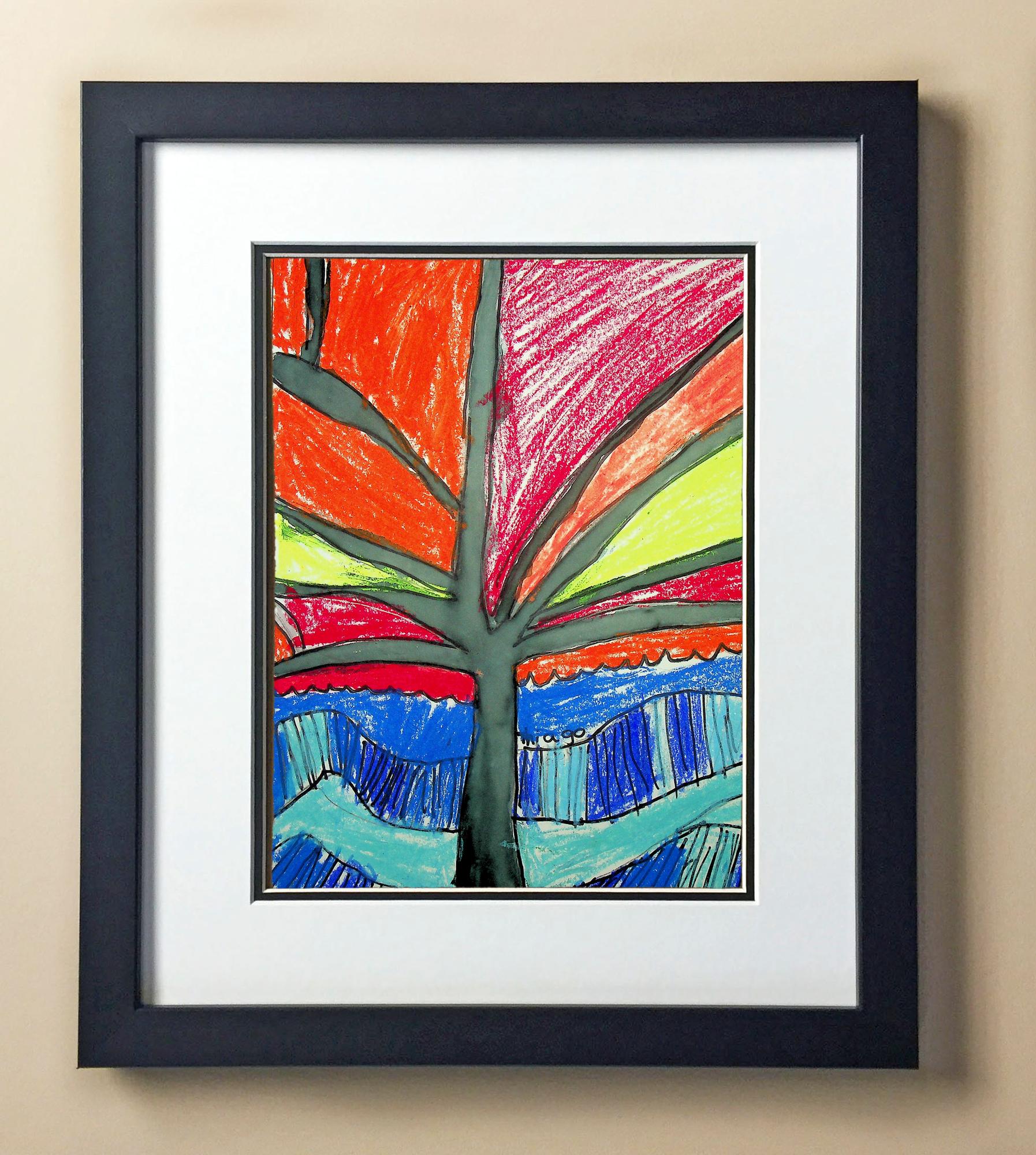 Included with the purchase is the Students Artwork, Frame, double matboard, shatter proof plexiglass, and a ready to hang backerboard with turnbuttons