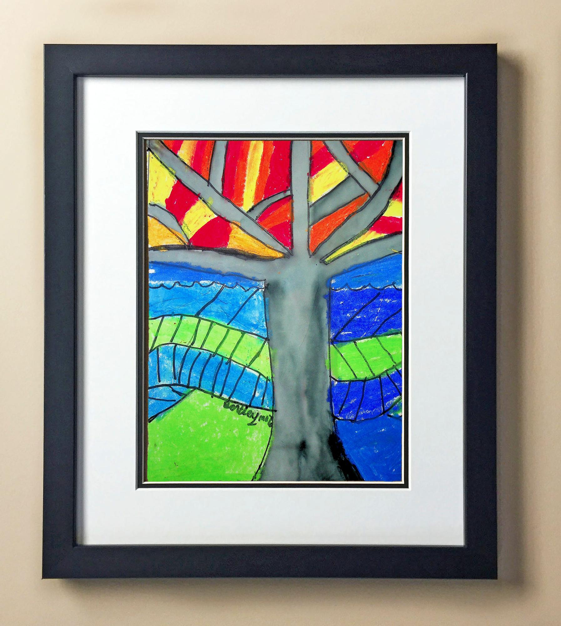Included with the purchase is the Students Artwork, Frame, double matboard, shatter proof plexiglass, and a ready to hang backerboard with turnbuttons