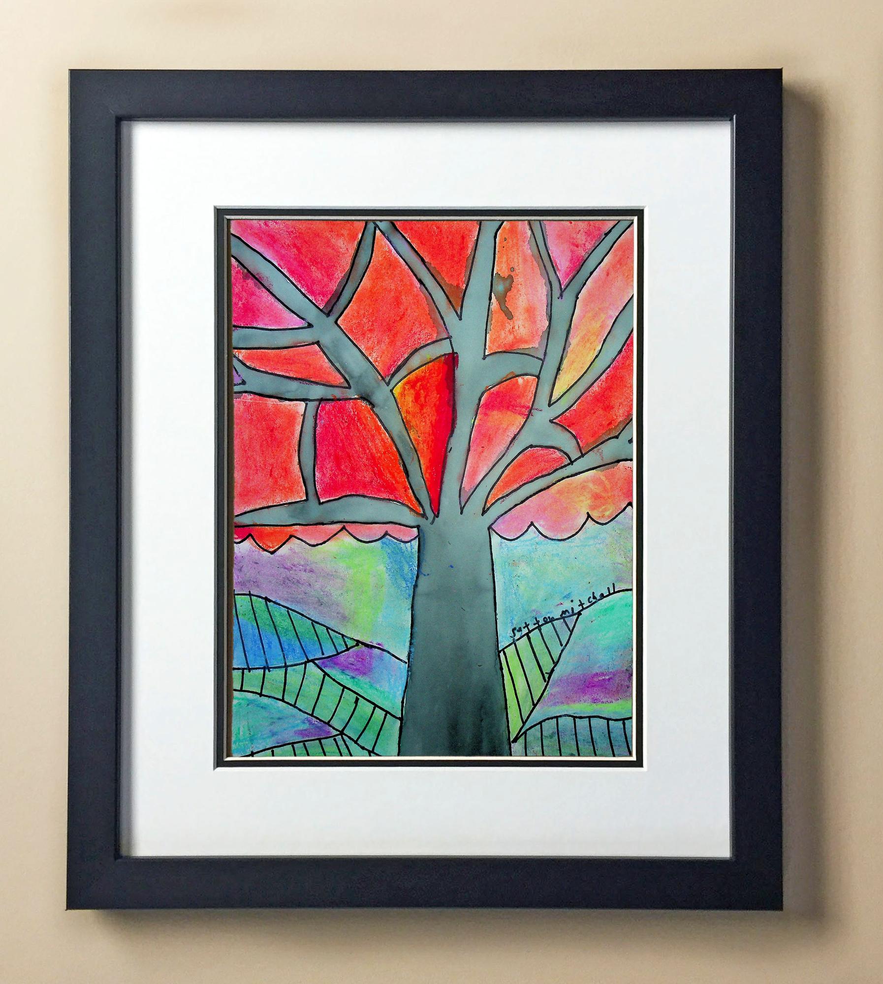 Included with the purchase is the Students Artwork, Frame, double matboard, shatter proof plexiglass, and a ready to hang backerboard with turnbuttons
