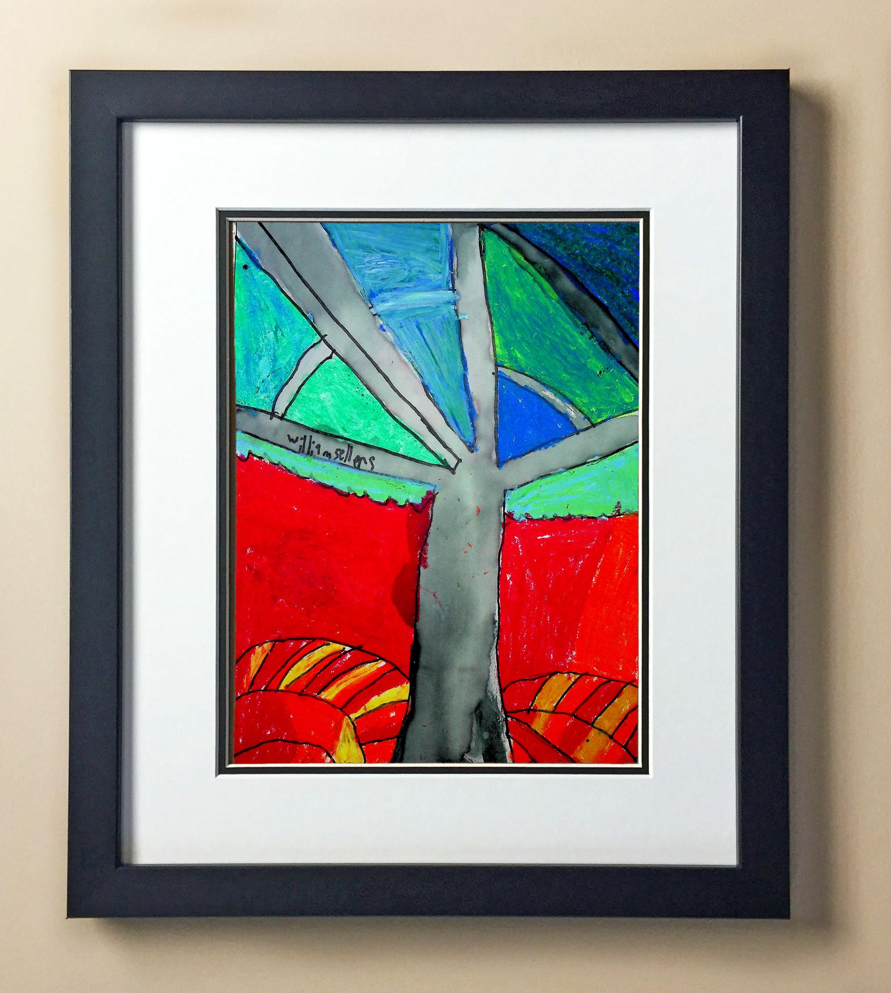 Included with the purchase is the Students Artwork, Frame, double matboard, shatter proof plexiglass, and a ready to hang backerboard with turnbuttons