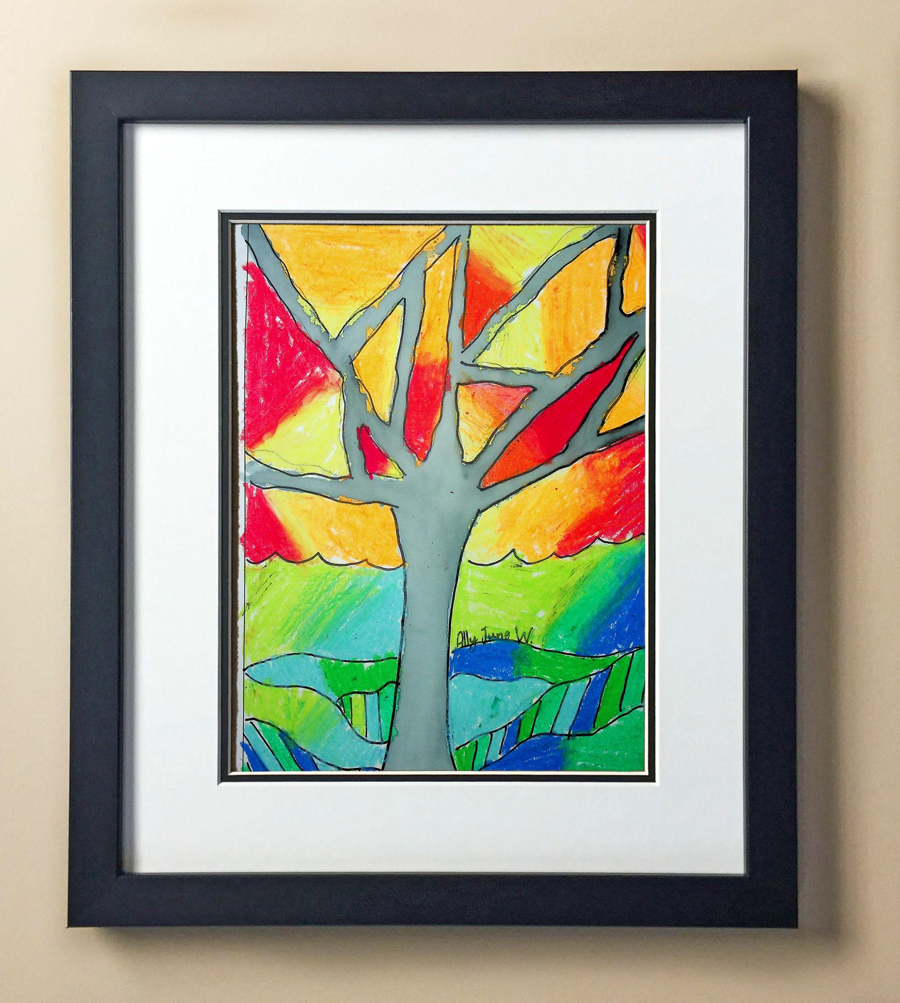 Included with the purchase is the Students Artwork, Frame, double matboard, shatter proof plexiglass, and a ready to hang backerboard with turnbuttons