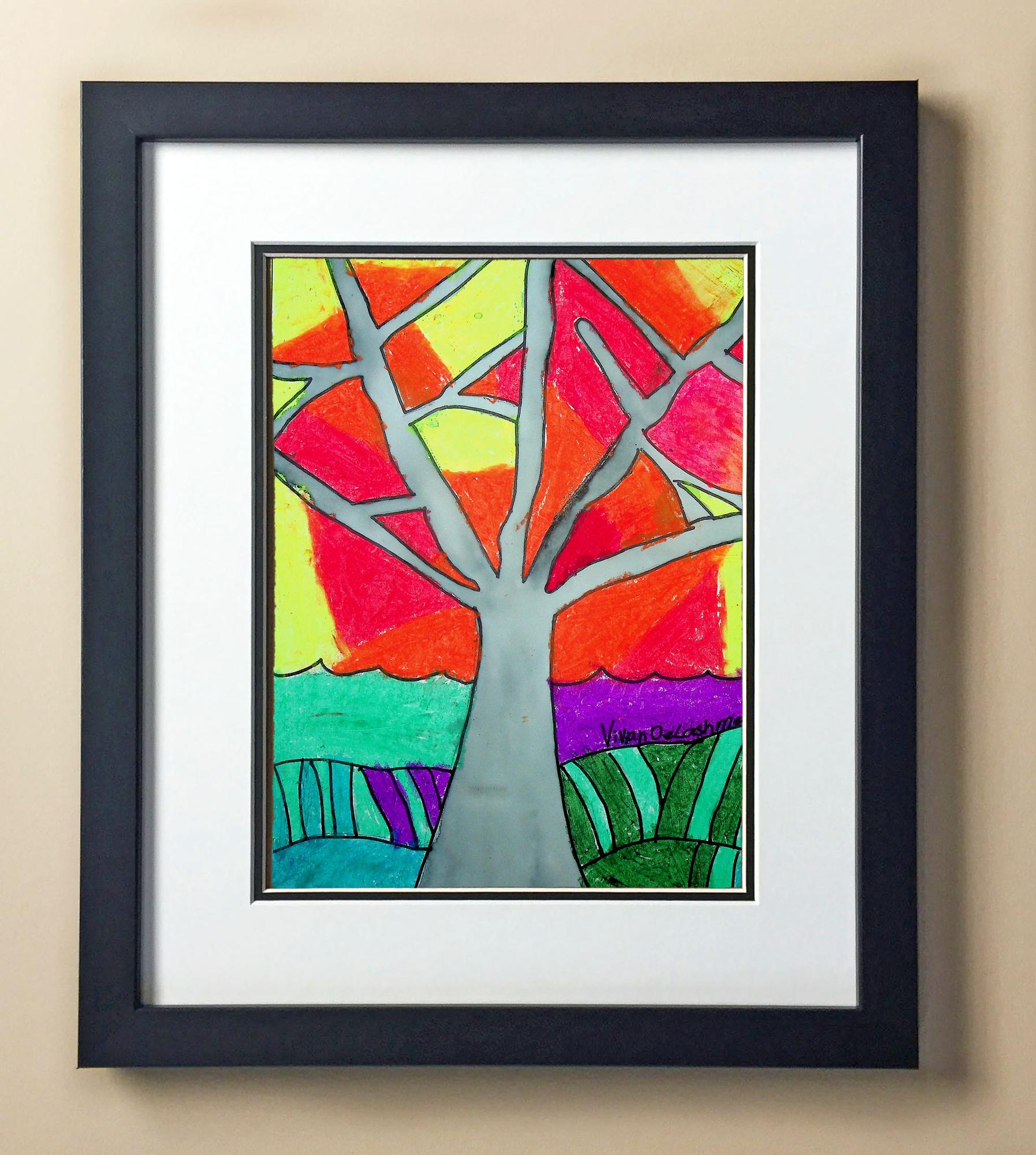 Included with the purchase is the Students Artwork, Frame, double matboard, shatter proof plexiglass, and a ready to hang backerboard with turnbuttons