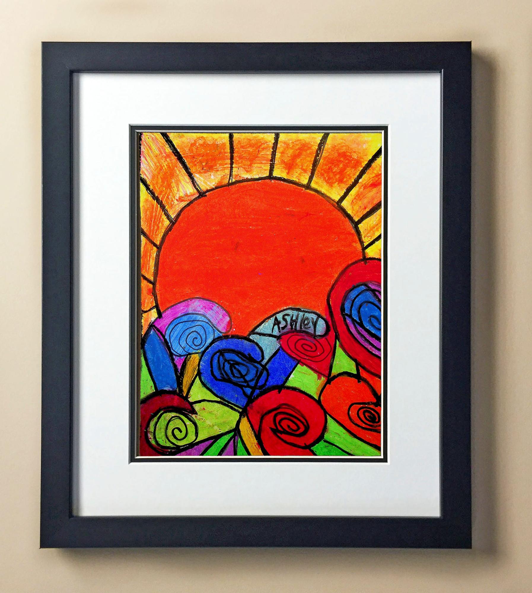 Included with the purchase is the Students Artwork, Frame, double matboard, shatter proof plexiglass, and a ready to hang backerboard with turnbuttons