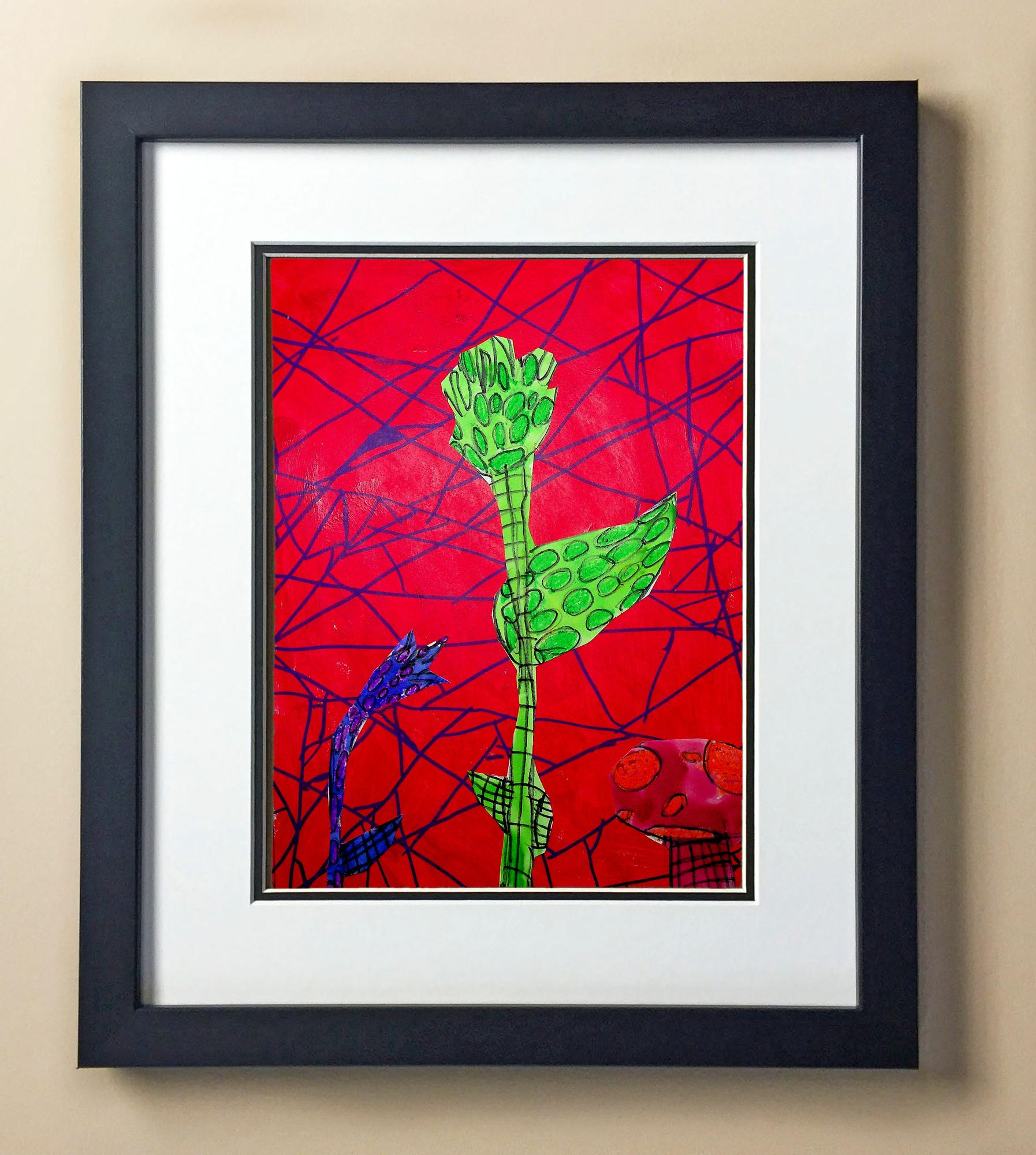 Included with the purchase is the Students Artwork, Frame, double matboard, shatter proof plexiglass, and a ready to hang backerboard with turnbuttons
