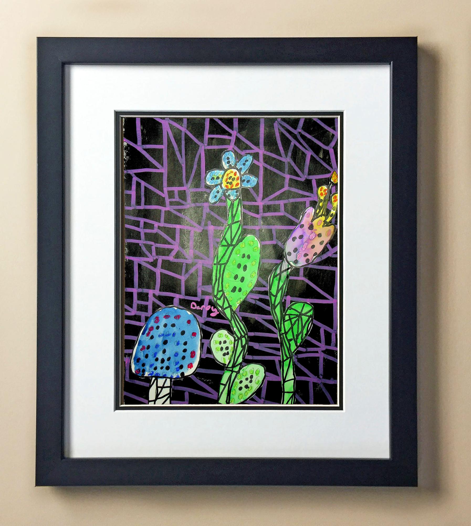 Included with the purchase is the Students Artwork, Frame, double matboard, shatter proof plexiglass, and a ready to hang backerboard with turnbuttons