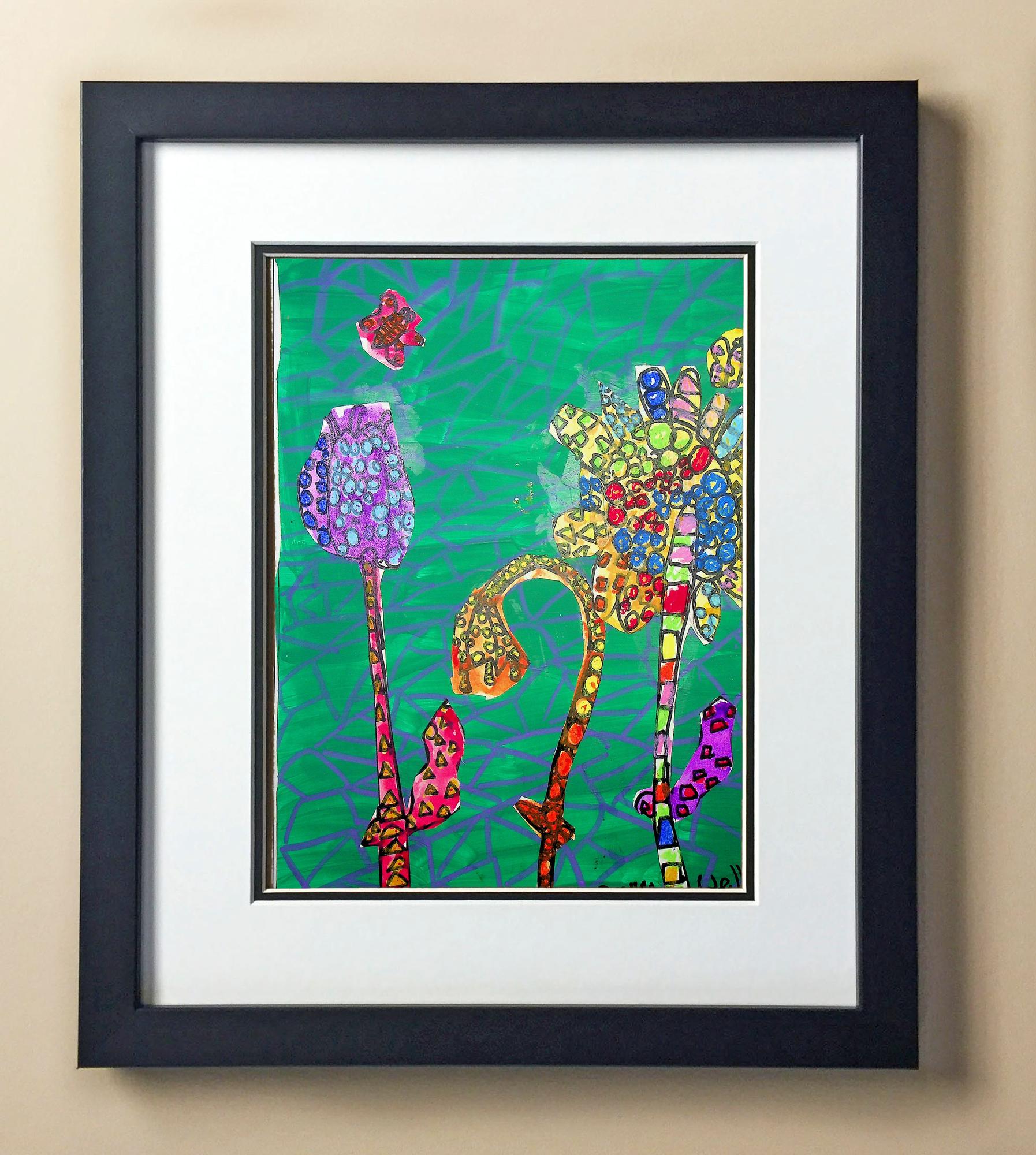 Included with the purchase is the Students Artwork, Frame, double matboard, shatter proof plexiglass, and a ready to hang backerboard with turnbuttons